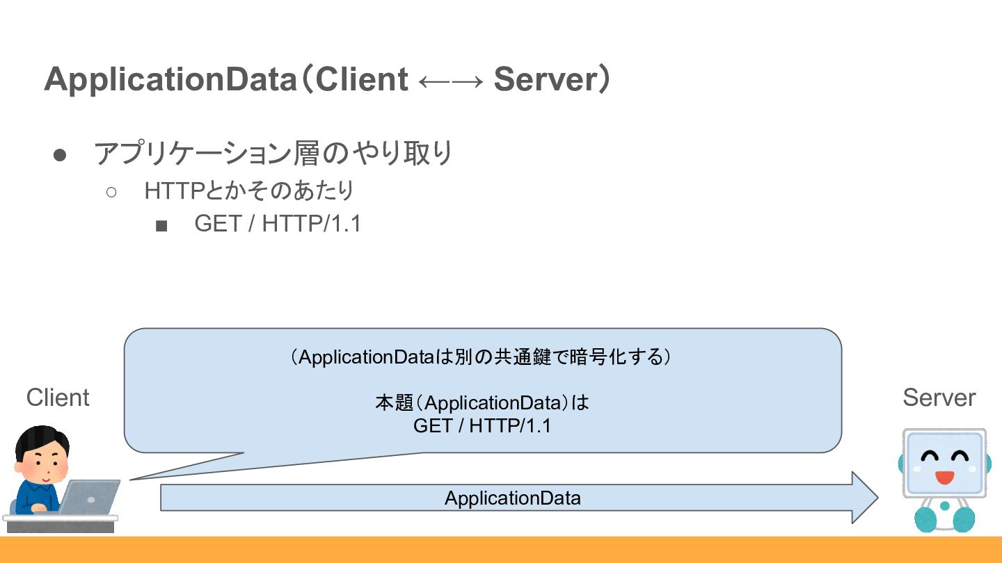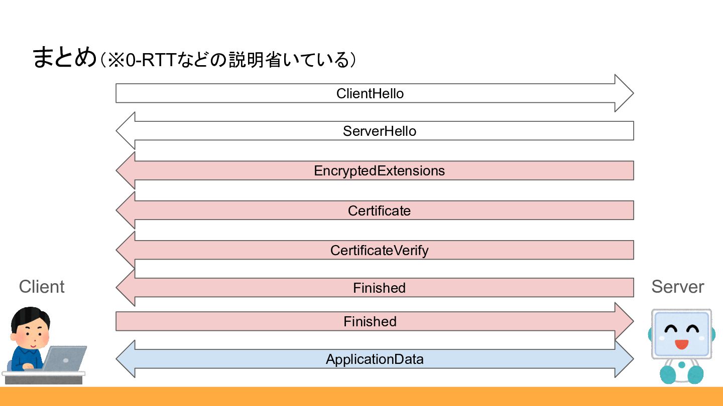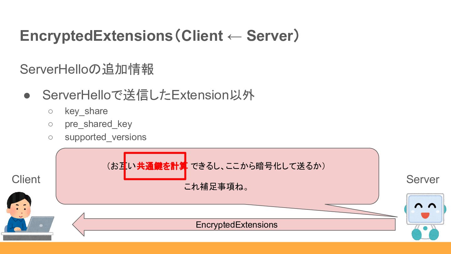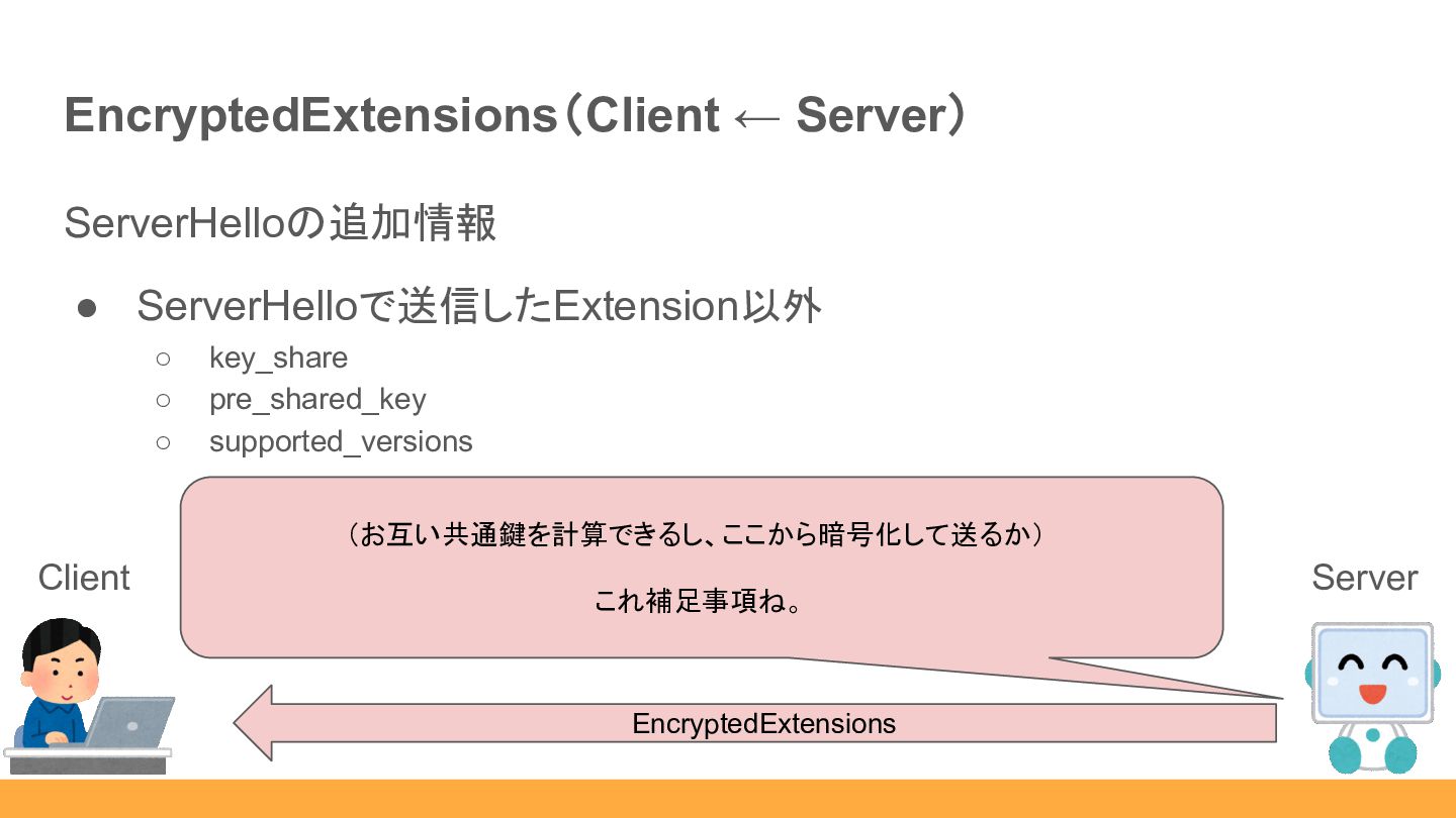 ◦ supported_versions EncryptedExtensions Client (お互い共通鍵を計算 できるし、ここから暗号化して送るか) これ補足事項ね。 Server
