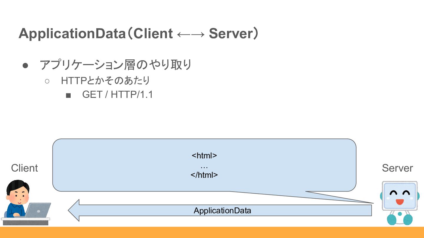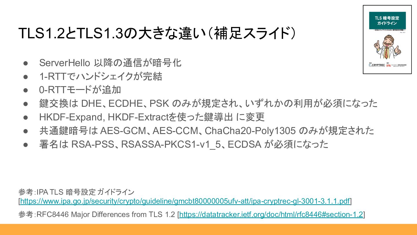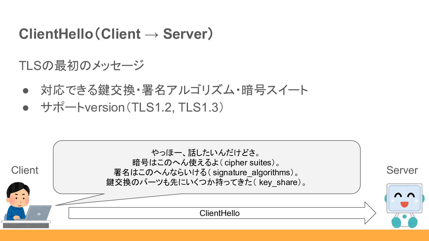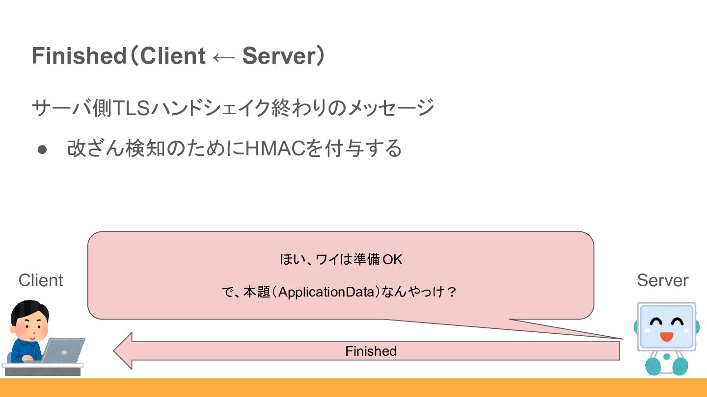 ◦ supported_versions EncryptedExtensions Client (お互い共通鍵を計算 できるし、ここから暗号化して送るか) これ補足事項ね。 Server