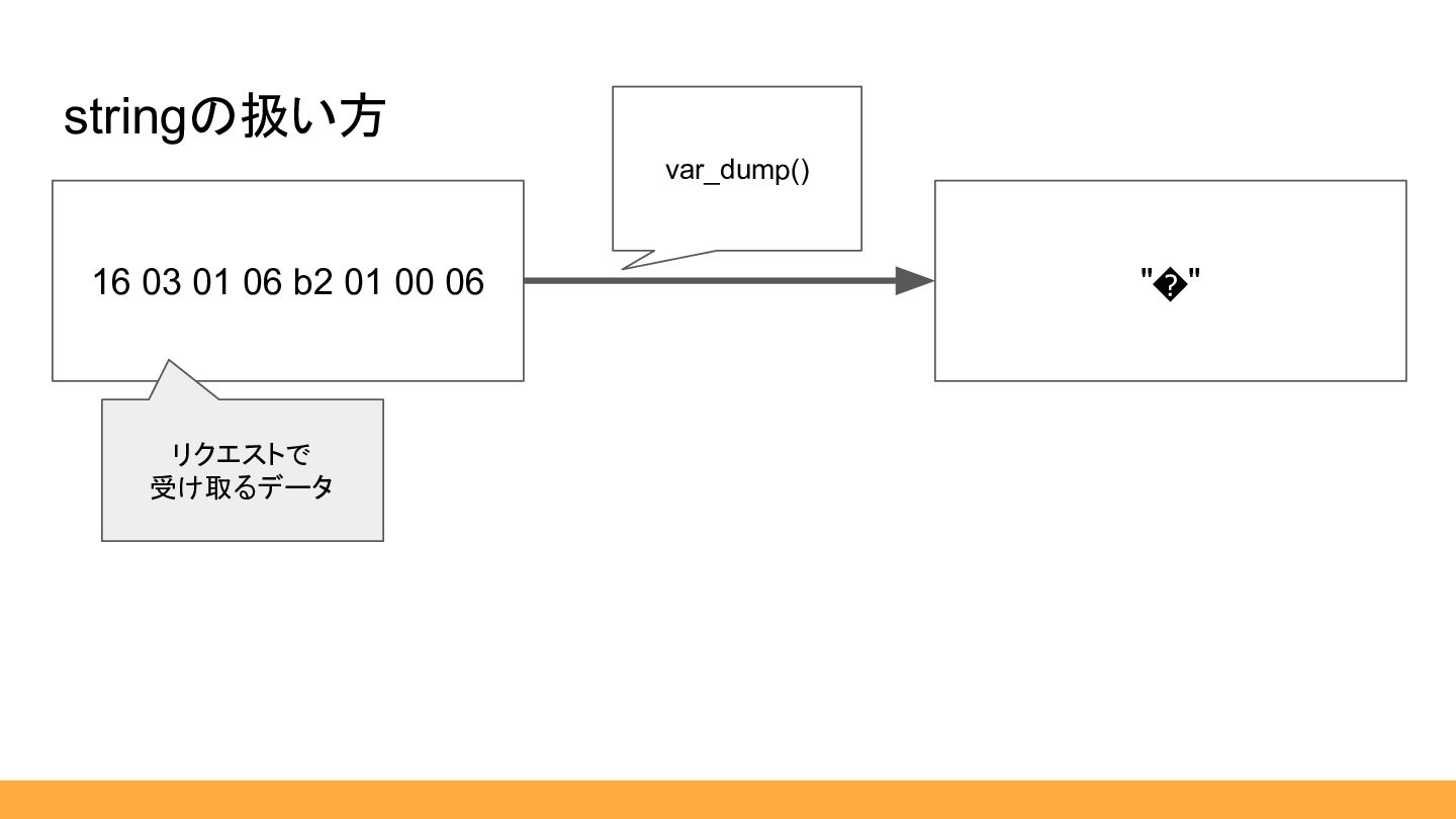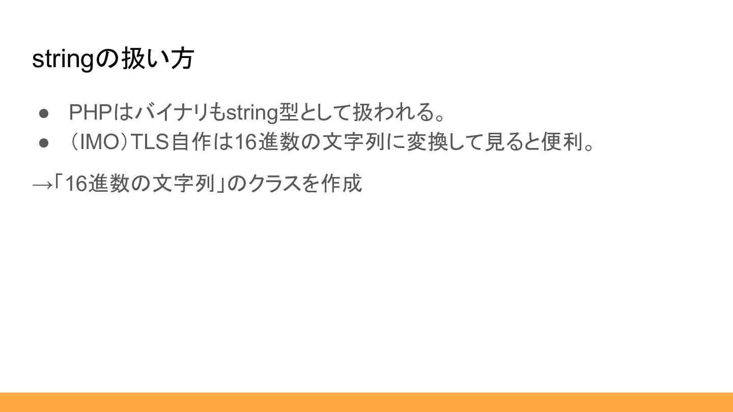 • PHPはバイナリもstring型として扱われる。 • (IMO)TLS自作は16進数の文字列に変換して見ると便利。 →「16進数の文字列」のクラスを作成 stringの扱い方
