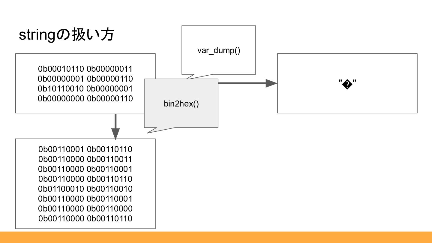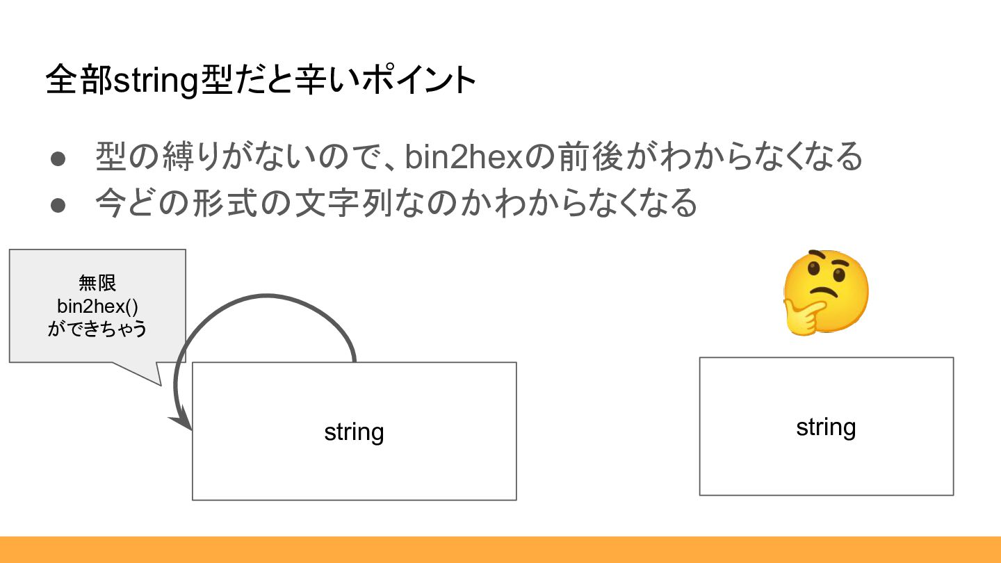 • 型の縛りがないので、bin2hexの前後がわからなくなる • 今どの形式の文字列なのかわからなくなる 全部string型だと辛いポイント 無限 bin2hex() ができちゃう string string