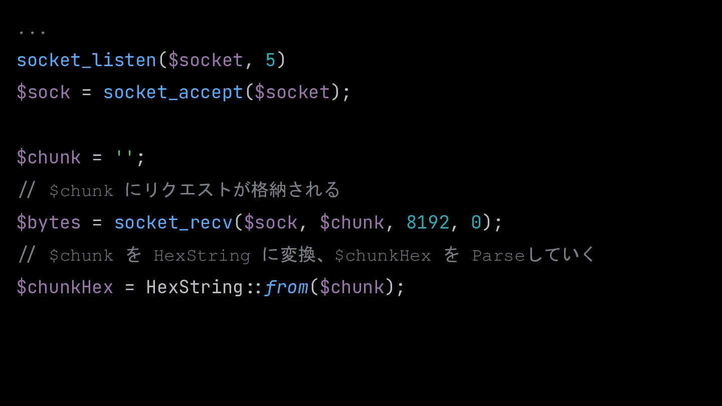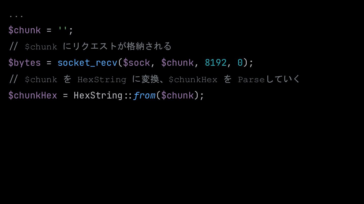 $sock = socket_accept($socket); $chunk = ''; :/ $chunk にリクエストが格納される $bytes = socket_recv($sock, $chunk, 8192, 0); :/ $chunk を HexString に変換、$chunkHex を Parseしていく $chunkHex = HexString::from($chunk);