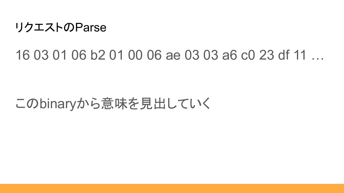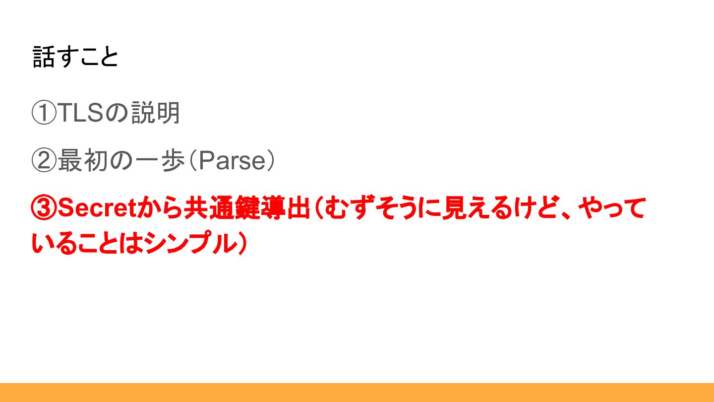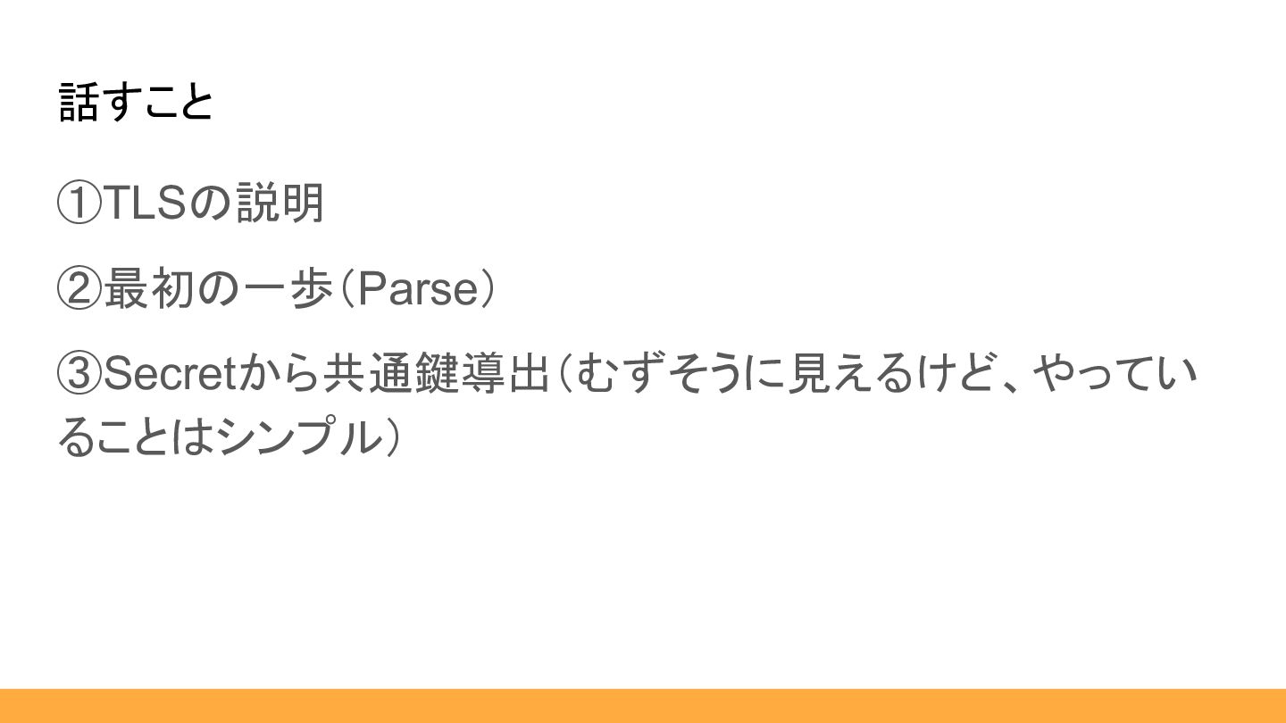 話すこと ①TLSの説明 ②最初の一歩(Parse) ③Secretから共通鍵導出(むずそうに見えるけど、やって いることはシンプル)