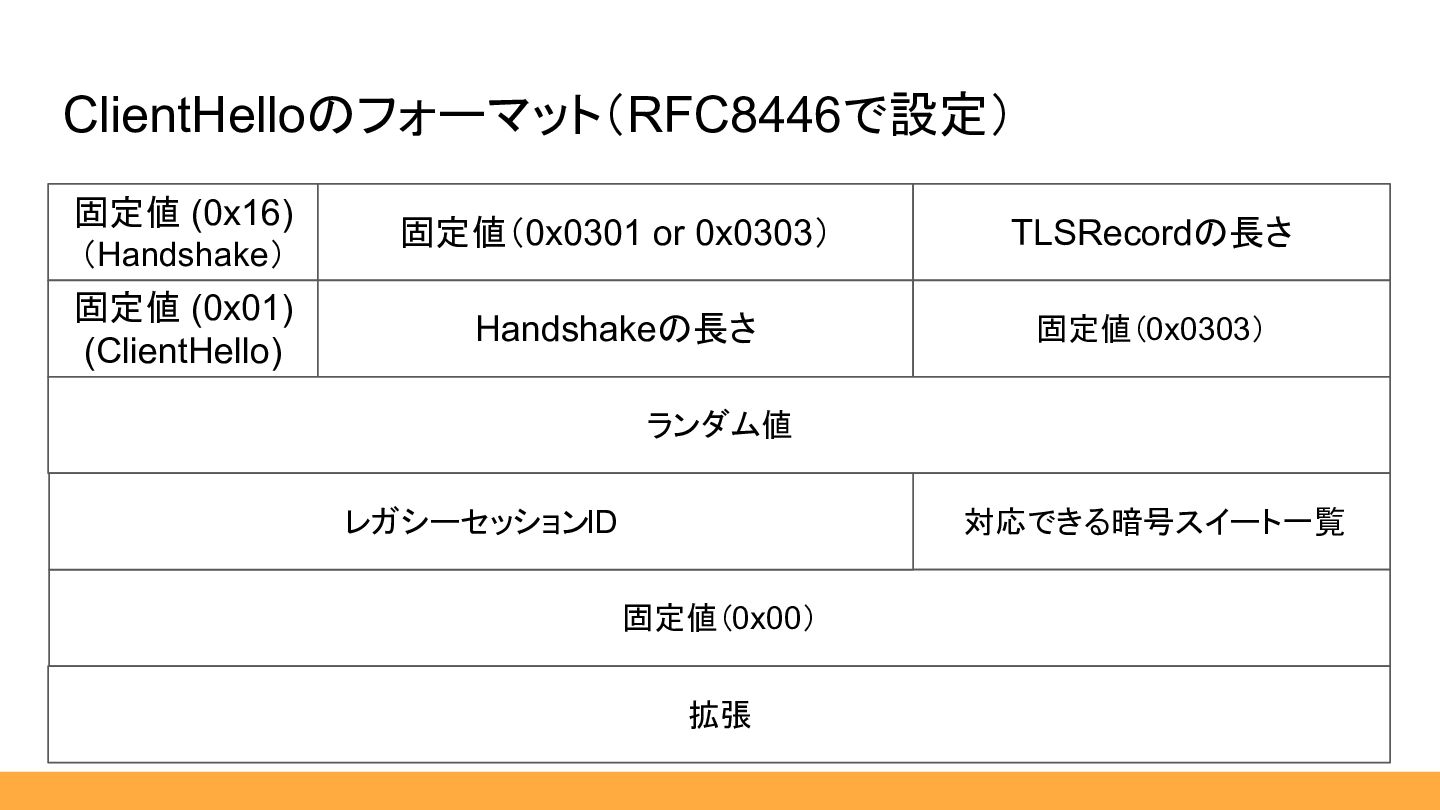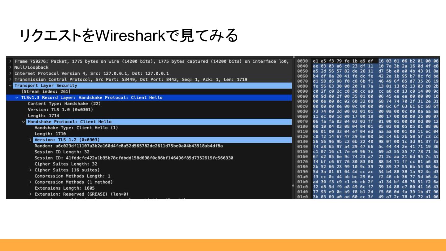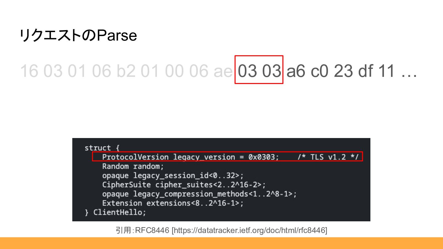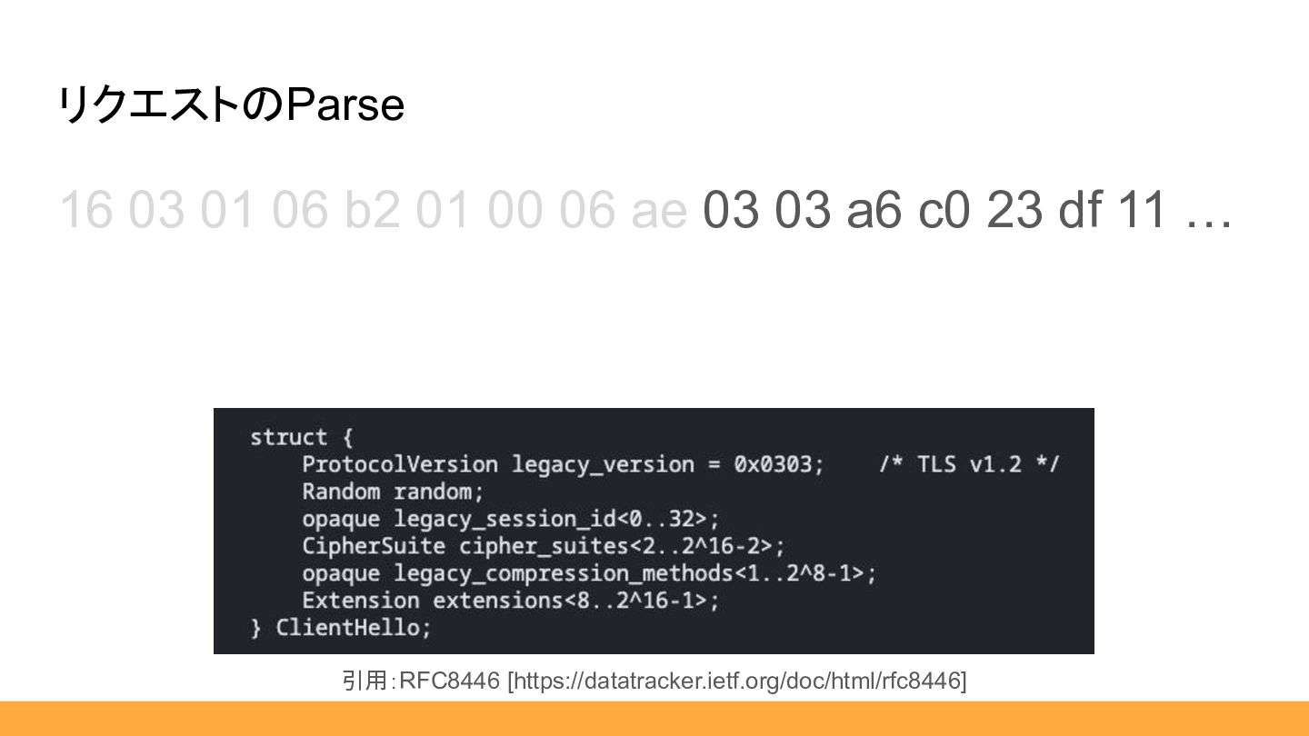 03 a6 c0 23 df 11 … リクエストのParse 引用:RFC8446 [https://datatracker.ietf.org/doc/html/rfc8446] ClientHelloの中身