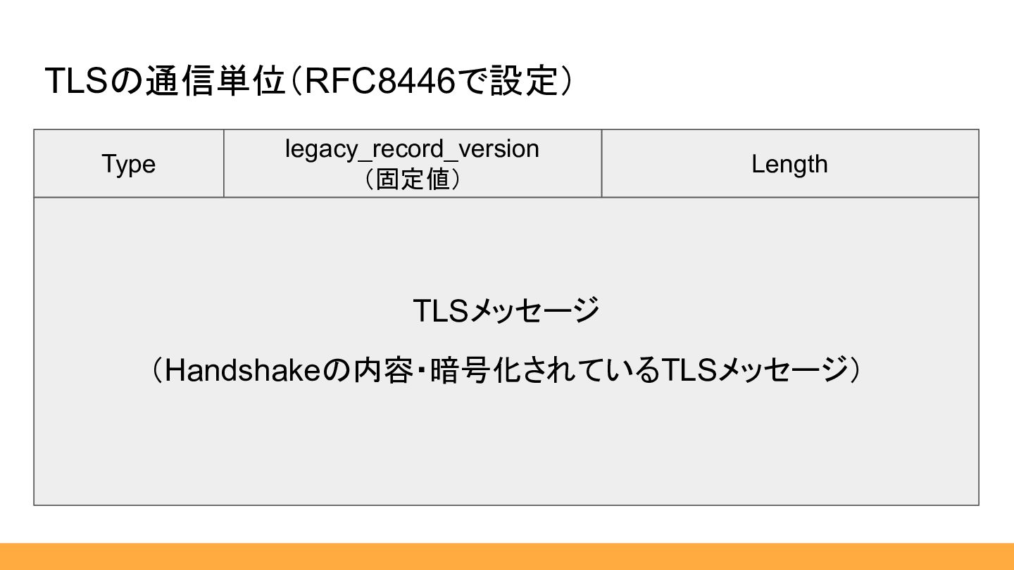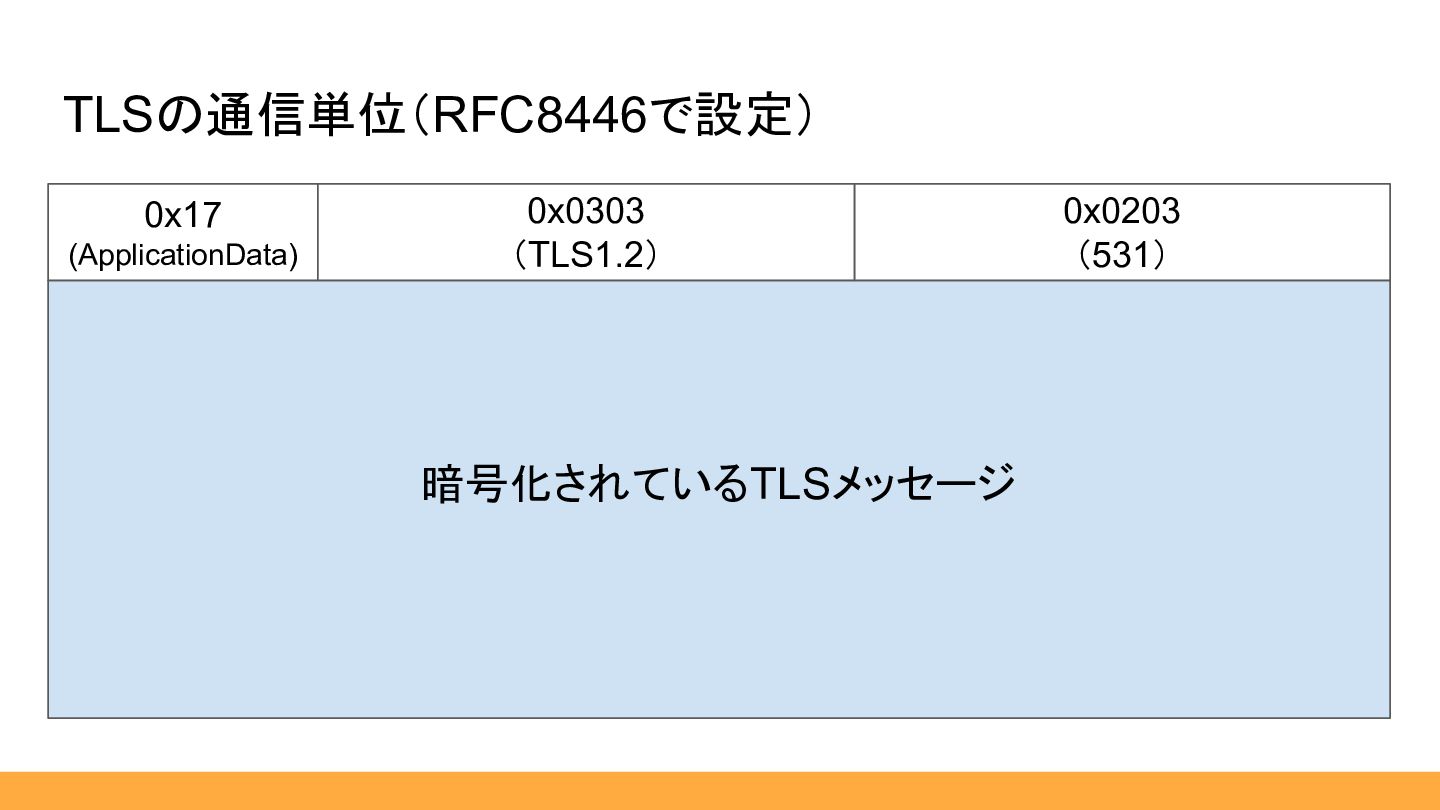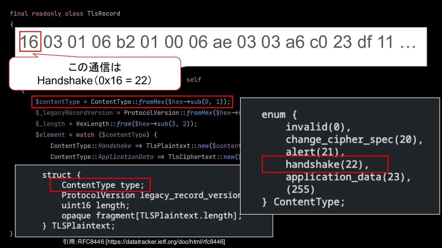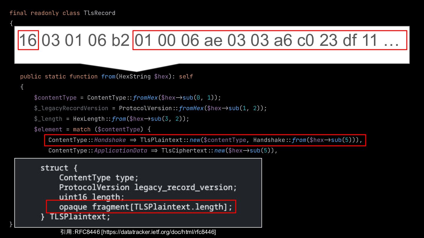 $element, ) {} public static function from(HexString $hex): self { $contentType = ContentType::fromHex($hex:>sub(0, 1)); $_legacyRecordVersion = ProtocolVersion::fromHex($hex:>sub(1, 2)); $_length = HexLength::from($hex:>sub(3, 2)); $element = match ($contentType) { ContentType::Handshake :> TlsPlaintext::new($contentType, Handshake::from($hex:>sub(5))), ContentType::ApplicationData :> TlsCiphertext::new($hex:>sub(5)), default :> $hex:>sub(5), }; return new self( element: $element, ); } } 16 03 01 06 b2 01 00 06 ae 03 03 a6 c0 23 df 11 … 引用:RFC8446 [https://datatracker.ietf.org/doc/html/rfc8446] TLSPlaintext長さは 1714(0x06b2)