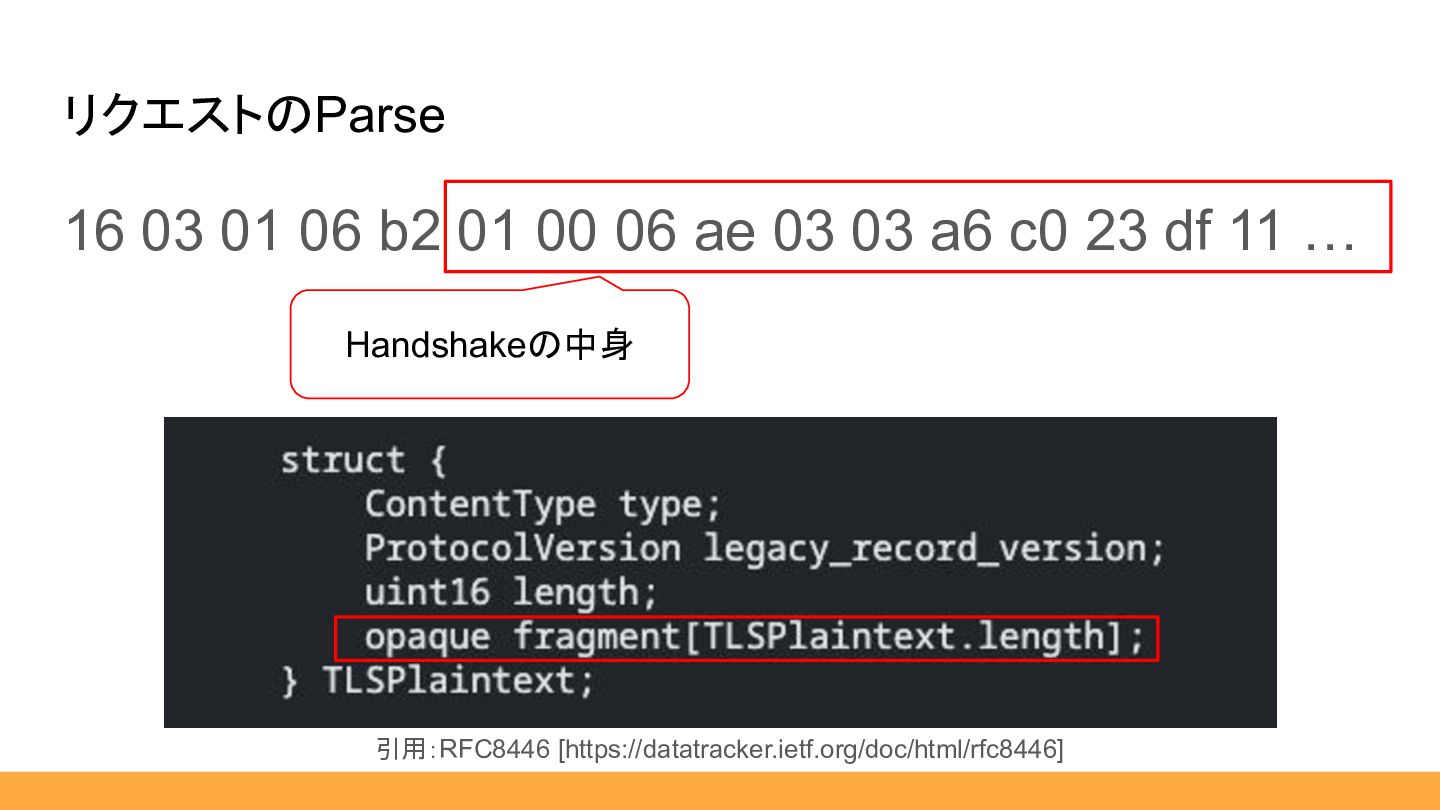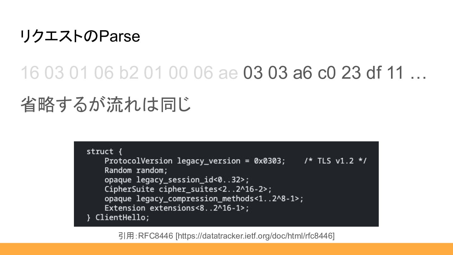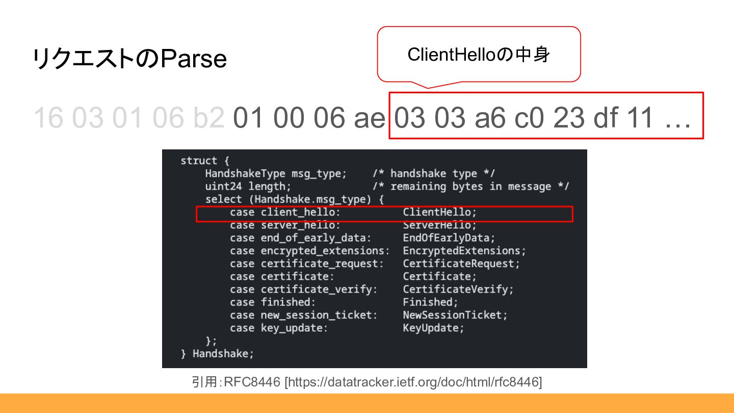 $msgType, public HexLength $length, public ClientHello|HandshakeResponder $body, ) {} … } public static function from(HexString $hex): self { $msgType = HandshakeType::fromHex($hex:>sub(0, 1)); $length = HexLength::from($hex:>sub(1, 3)); $body = match ($msgType) { HandshakeType::ClientHello :> ClientHello::from($hex:>sub(4)), default :> throw new \RuntimeException('not implemented'), }; return new self( msgType: $msgType, length: $length, body: $body, ); } 01 00 06 ae 03 03 a6 c0 23 df 11 … 引用:RFC8446 [https://datatracker.ietf.org/doc/html/rfc8446] 省略しますが、流れは同じです。 ここまで補助スライド