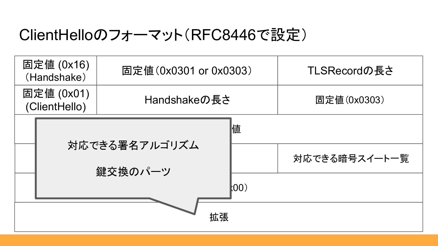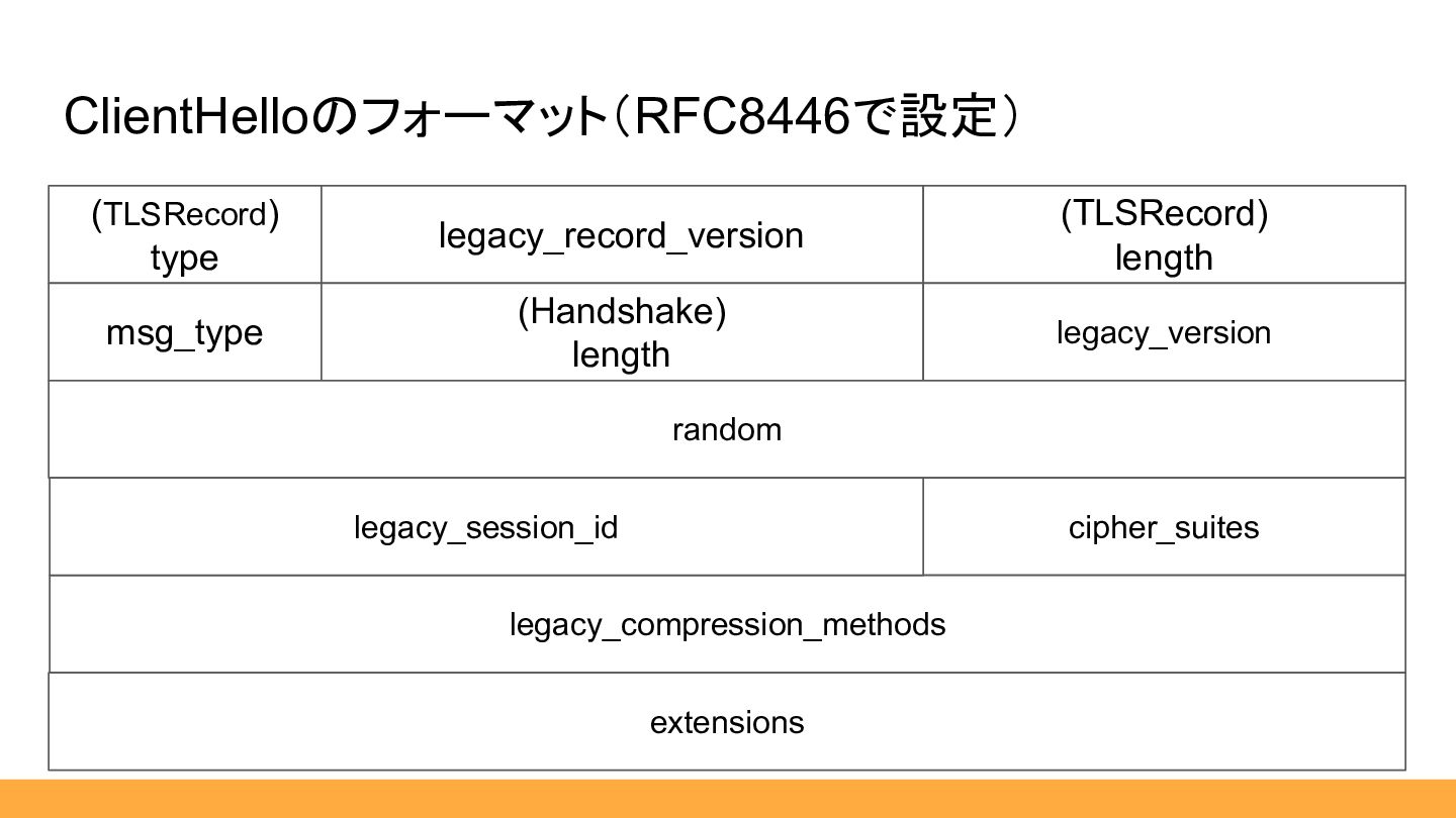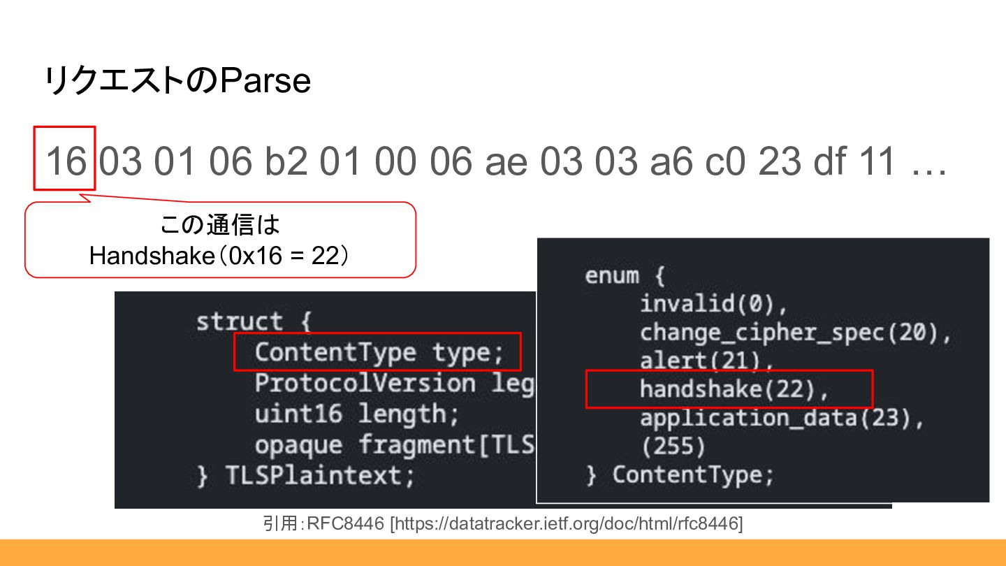 $msgType, public HexLength $length, public ClientHello|HandshakeResponder $body, ) {} … } public static function from(HexString $hex): self { $msgType = HandshakeType::fromHex($hex:>sub(0, 1)); $length = HexLength::from($hex:>sub(1, 3)); $body = match ($msgType) { HandshakeType::ClientHello :> ClientHello::from($hex:>sub(4)), default :> throw new \RuntimeException('not implemented'), }; return new self( msgType: $msgType, length: $length, body: $body, ); } 01 00 06 ae 03 03 a6 c0 23 df 11 … 引用:RFC8446 [https://datatracker.ietf.org/doc/html/rfc8446] 省略しますが、流れは同じです。 ここまで補助スライド