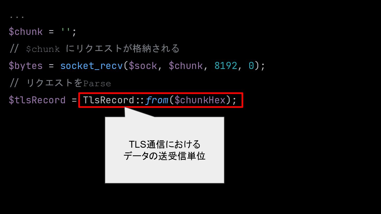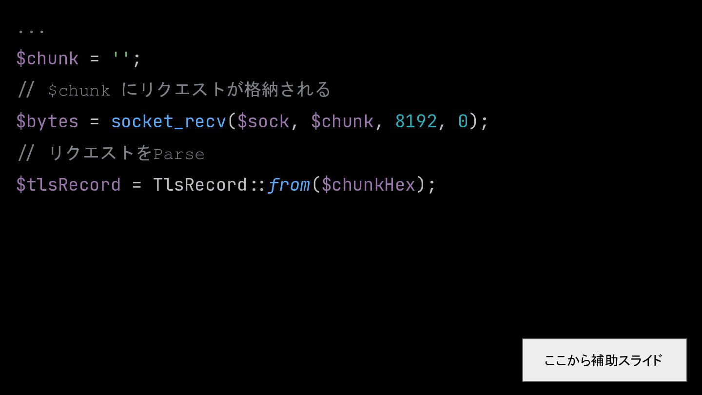 $chunk, 8192, 0); :/ リクエストをParse $tlsRecord = TlsRecord::from($chunkHex); ここから補助スライド