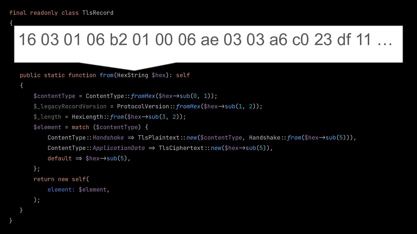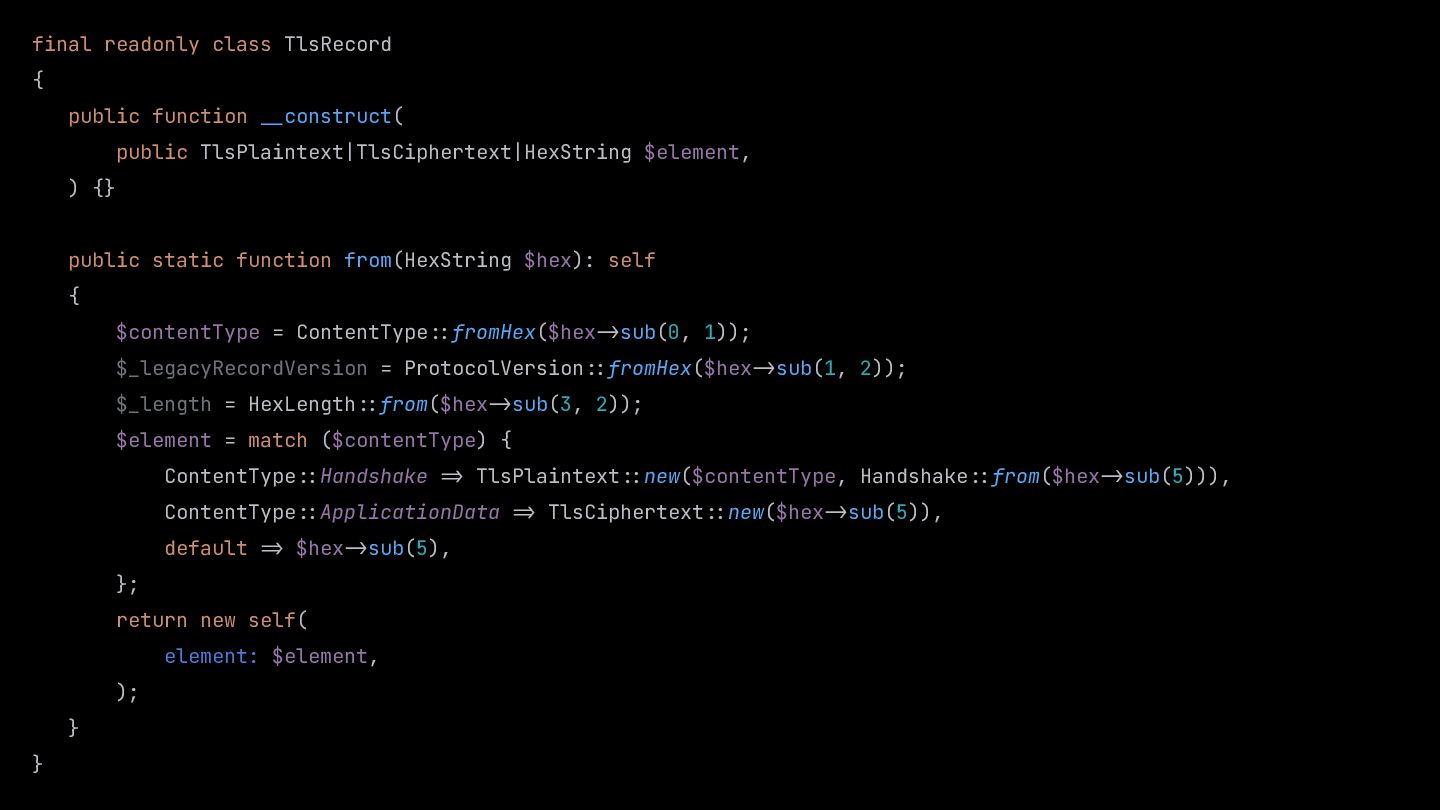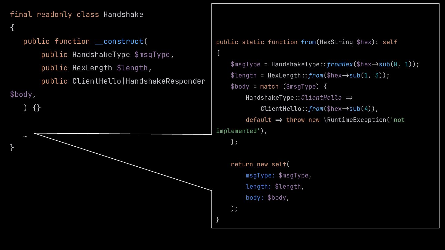 $msgType, public HexLength $length, public ClientHello|HandshakeResponder $body, ) {} … } public static function from(HexString $hex): self { $msgType = HandshakeType::fromHex($hex:>sub(0, 1)); $length = HexLength::from($hex:>sub(1, 3)); $body = match ($msgType) { HandshakeType::ClientHello :> ClientHello::from($hex:>sub(4)), default :> throw new \RuntimeException('not implemented'), }; return new self( msgType: $msgType, length: $length, body: $body, ); }