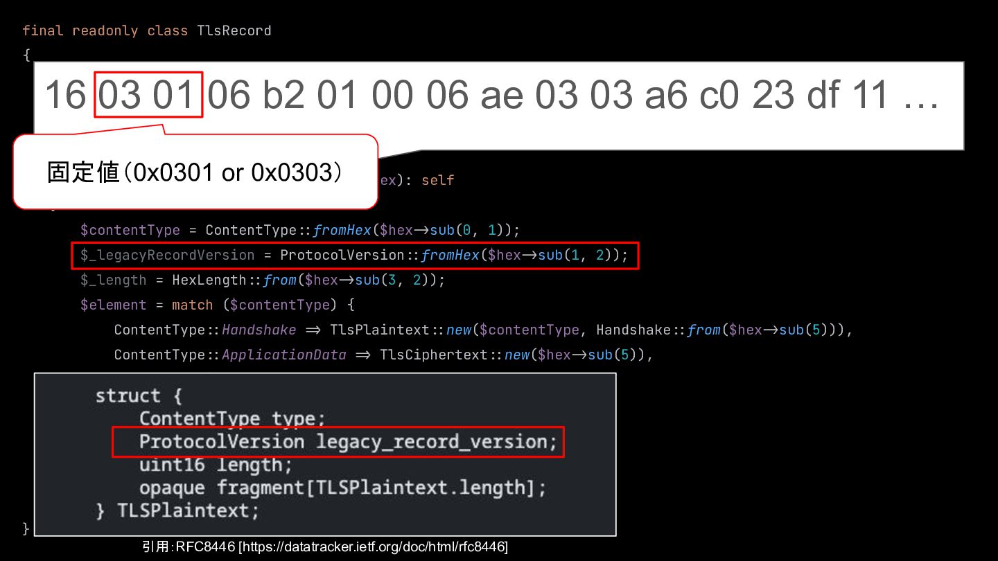 $element, ) {} public static function from(HexString $hex): self { $contentType = ContentType::fromHex($hex:>sub(0, 1)); $_legacyRecordVersion = ProtocolVersion::fromHex($hex:>sub(1, 2)); $_length = HexLength::from($hex:>sub(3, 2)); $element = match ($contentType) { ContentType::Handshake :> TlsPlaintext::new($contentType, Handshake::from($hex:>sub(5))), ContentType::ApplicationData :> TlsCiphertext::new($hex:>sub(5)), default :> $hex:>sub(5), }; return new self( element: $element, ); } } 16 03 01 06 b2 01 00 06 ae 03 03 a6 c0 23 df 11 … 引用:RFC8446 [https://datatracker.ietf.org/doc/html/rfc8446] 固定値(0x0301 or 0x0303)