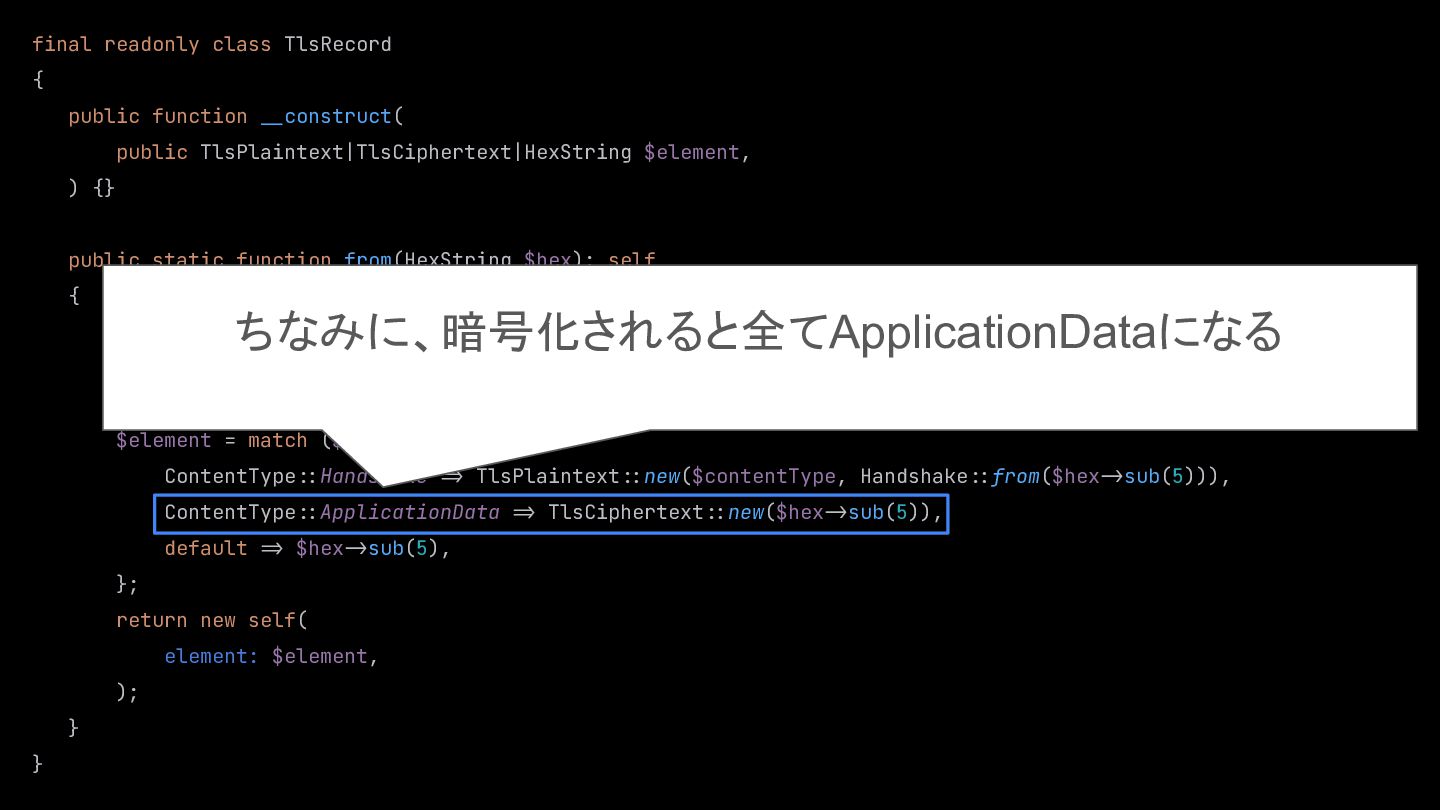 $element, ) {} public static function from(HexString $hex): self { $contentType = ContentType::fromHex($hex:>sub(0, 1)); $_legacyRecordVersion = ProtocolVersion::fromHex($hex:>sub(1, 2)); $_length = HexLength::from($hex:>sub(3, 2)); $element = match ($contentType) { ContentType::Handshake :> TlsPlaintext::new($contentType, Handshake::from($hex:>sub(5))), ContentType::ApplicationData :> TlsCiphertext::new($hex:>sub(5)), default :> $hex:>sub(5), }; return new self( element: $element, ); } } ちなみに、暗号化されると全てApplicationDataになる