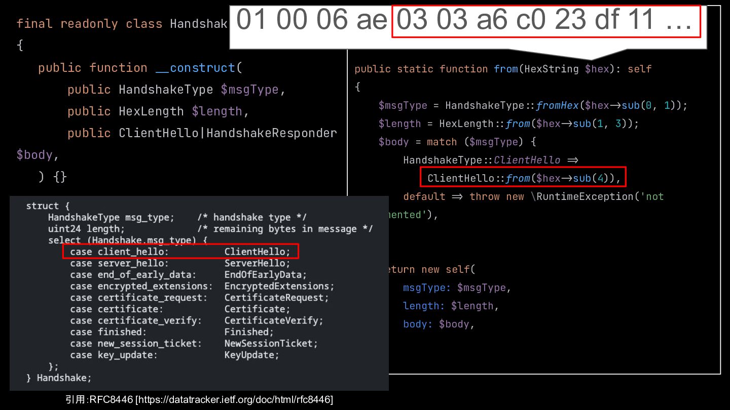 $msgType, public HexLength $length, public ClientHello|HandshakeResponder $body, ) {} … } public static function from(HexString $hex): self { $msgType = HandshakeType::fromHex($hex:>sub(0, 1)); $length = HexLength::from($hex:>sub(1, 3)); $body = match ($msgType) { HandshakeType::ClientHello :> ClientHello::from($hex:>sub(4)), default :> throw new \RuntimeException('not implemented'), }; return new self( msgType: $msgType, length: $length, body: $body, ); } 01 00 06 ae 03 03 a6 c0 23 df 11 … 引用:RFC8446 [https://datatracker.ietf.org/doc/html/rfc8446]