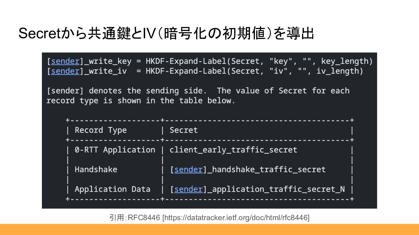 Secretから共通鍵とIV(暗号化の初期値)を導出 引用:RFC8446 [https://datatracker.ietf.org/doc/html/rfc8446]