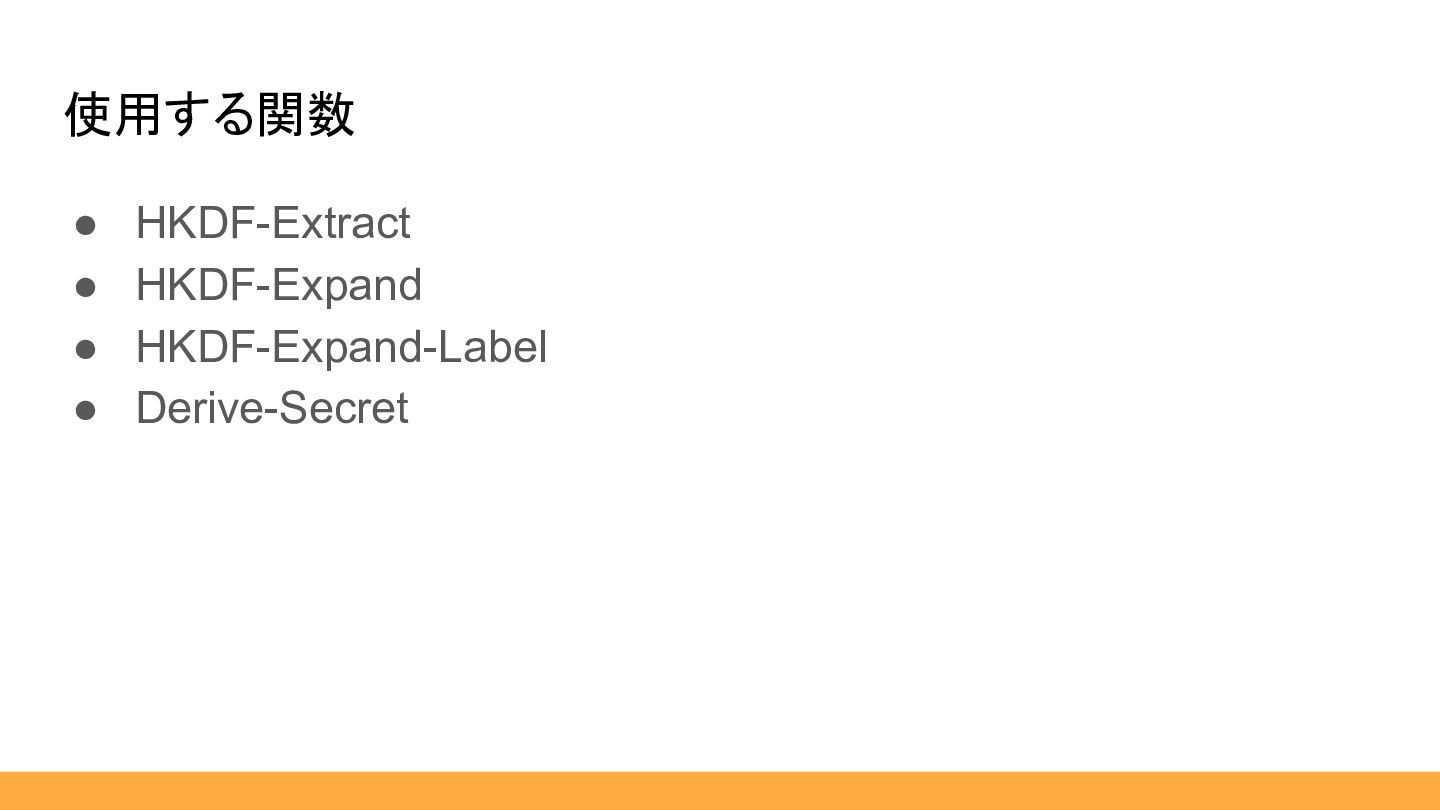 使用する関数 • HKDF-Extract • HKDF-Expand • HKDF-Expand-Label • Derive-Secret