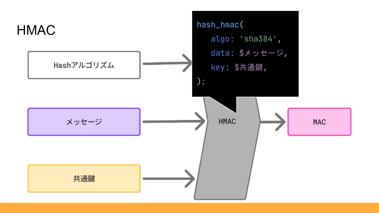 HMAC hash_hmac( algo: 'sha384', data: $メッセージ, key: $共通鍵, );