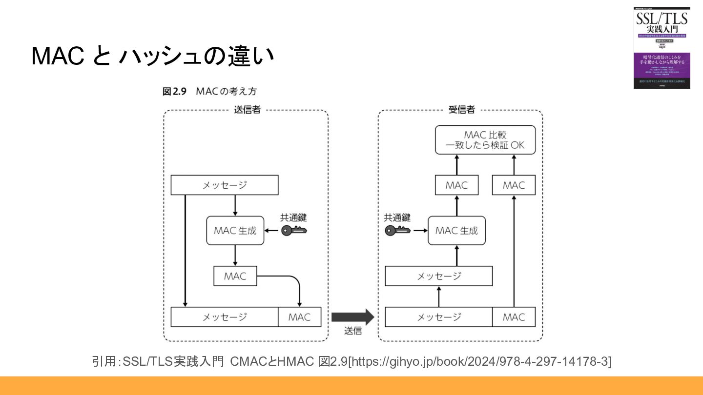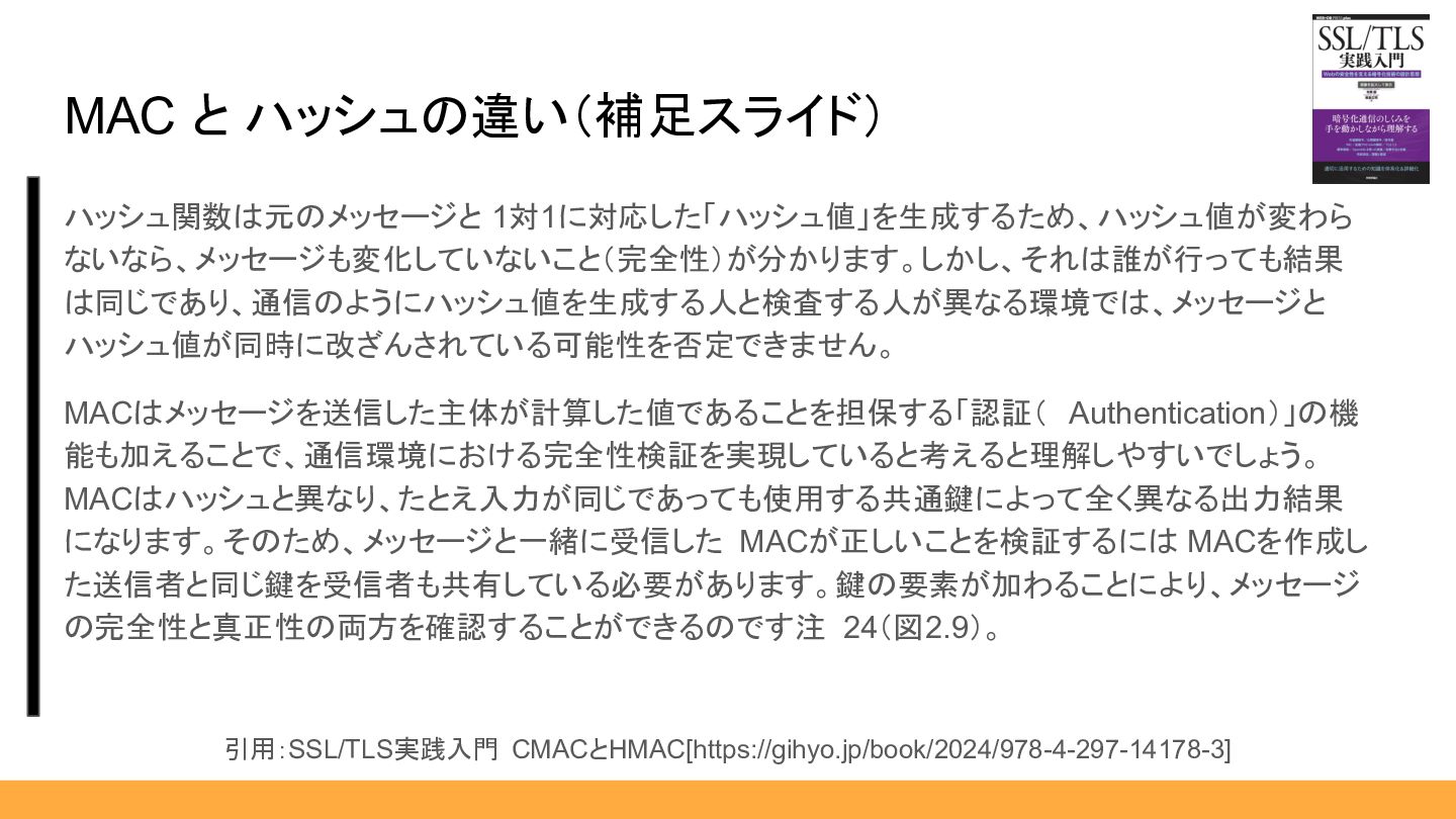 MACが正しいことを検証するには MACを作成し た送信者と同じ鍵を受信者も共有している必要があります。鍵の要素が加わることにより、メッセージ の完全性と真正性の両方を確認することができるのです注 24(図2.9)。 MAC と ハッシュの違い(補足スライド) 引用:SSL/TLS実践入門 CMACとHMAC[https://gihyo.jp/book/2024/978-4-297-14178-3]