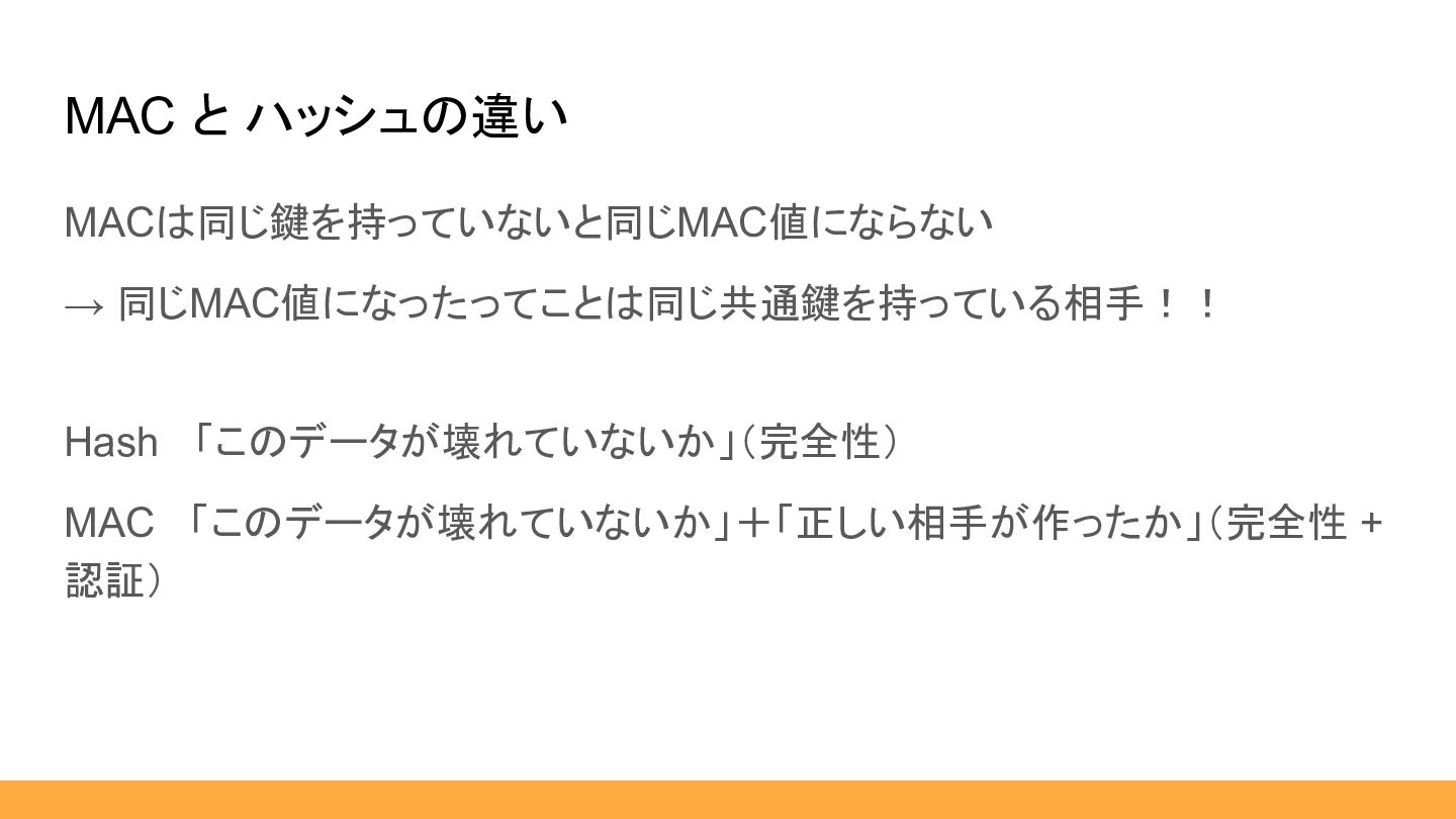 MACは同じ鍵を持っていないと同じMAC値にならない → 同じMAC値になったってことは同じ共通鍵を持っている相手!! Hash 「このデータが壊れていないか」(完全性) MAC 「このデータが壊れていないか」+「正しい相手が作ったか」(完全性 + 認証) MAC