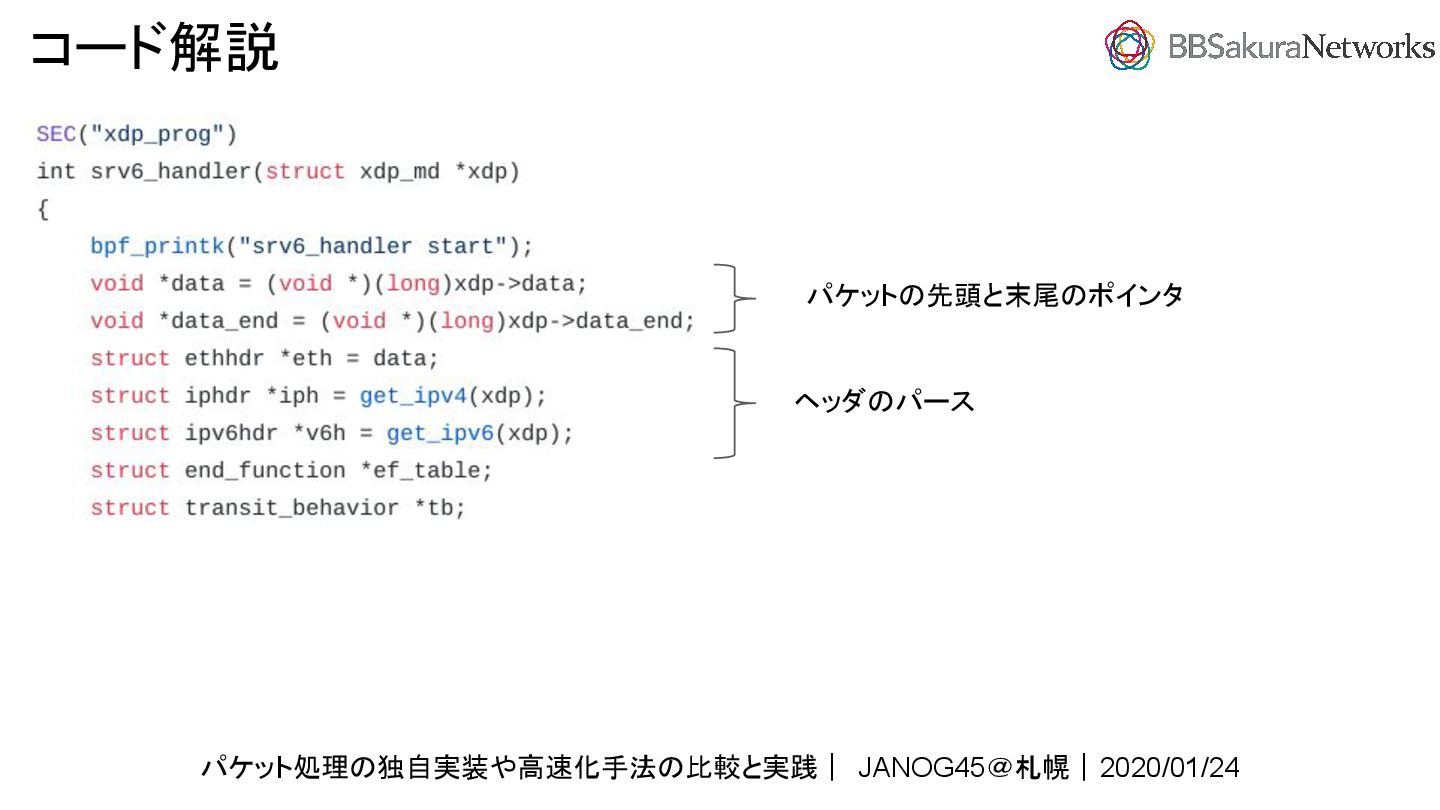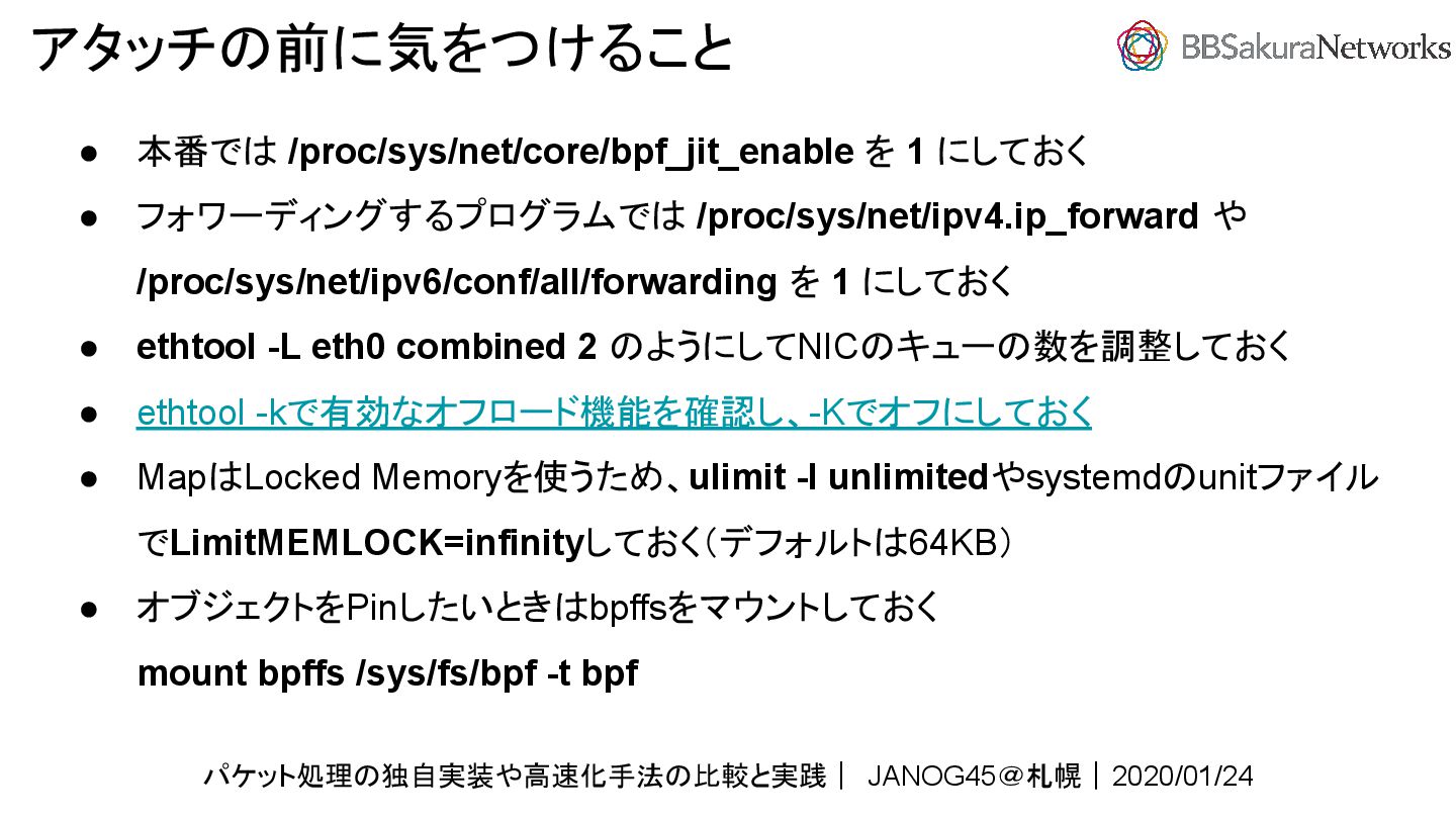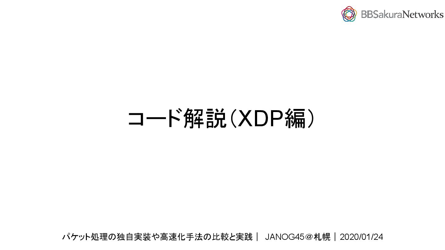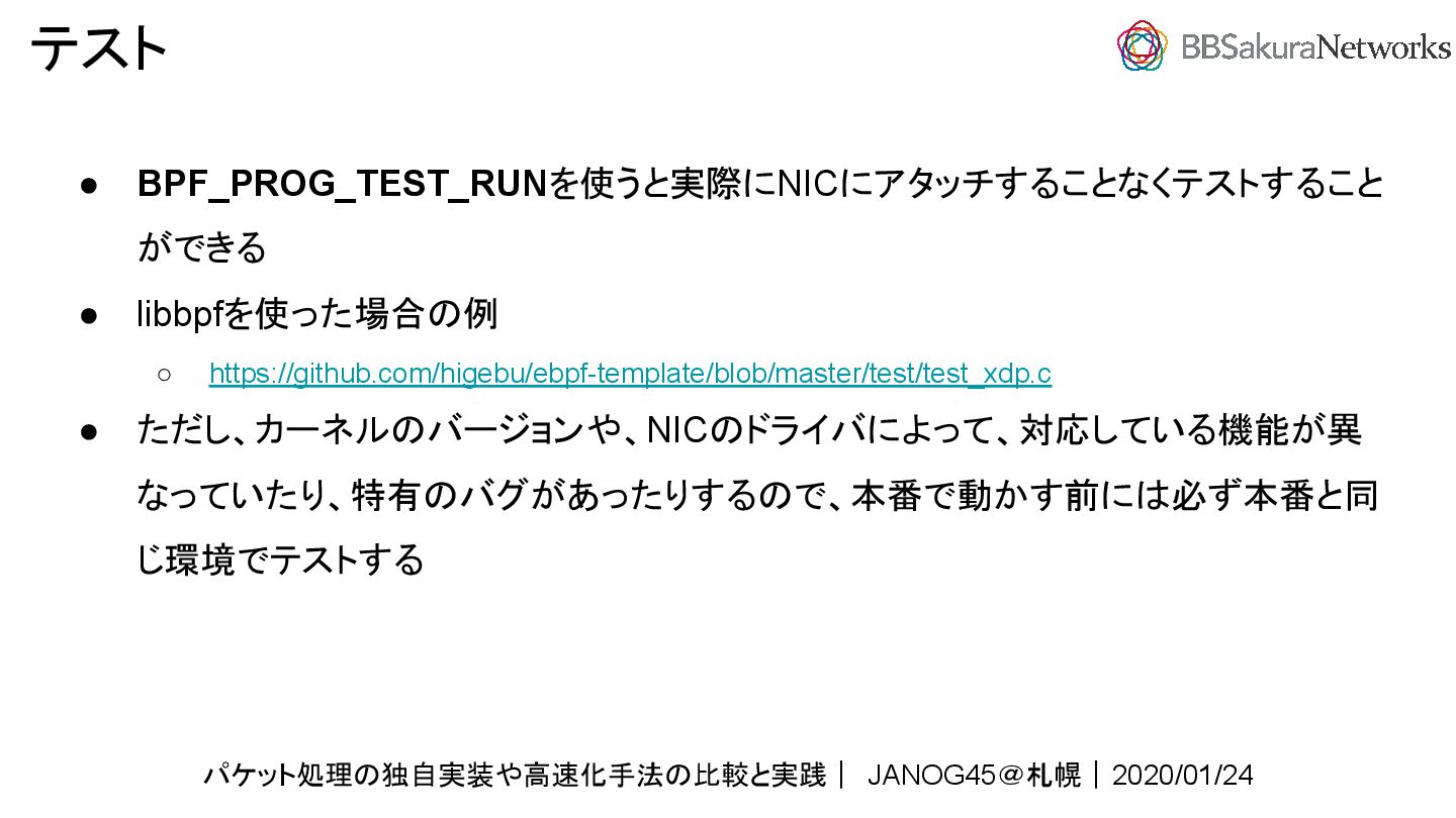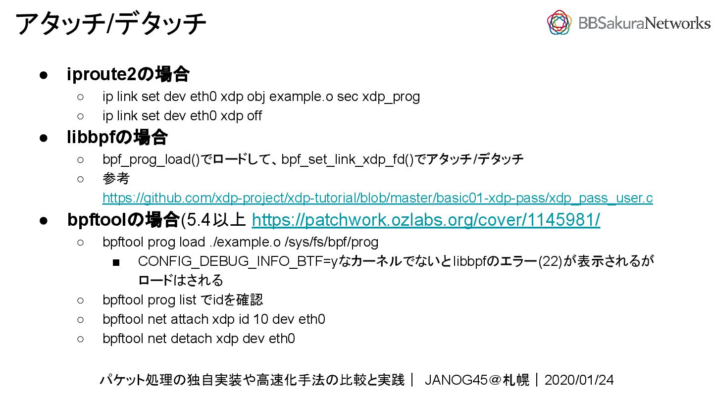 example.o sec xdp_prog ◦ ip link set dev eth0 xdp off • libbpfの場合 ◦ bpf_prog_load()でロードして、bpf_set_link_xdp_fd()でアタッチ/デタッチ ◦ 参考 https://github.com/xdp-project/xdp-tutorial/blob/master/basic01-xdp-pass/xdp_pass_user.c • bpftoolの場合(5.4以上 https://patchwork.ozlabs.org/cover/1145981/ ◦ bpftool prog load ./example.o /sys/fs/bpf/prog ▪ CONFIG_DEBUG_INFO_BTF=yなカーネルでないとlibbpfのエラー(22)が表示されるが ロードはされる ◦ bpftool prog list でidを確認 ◦ bpftool net attach xdp id 10 dev eth0 ◦ bpftool net detach xdp dev eth0 アタッチ/デタッチ パケット処理の独自実装や高速化手法の比較と実践| JANOG45@札幌|2020/01/24