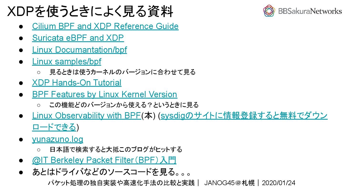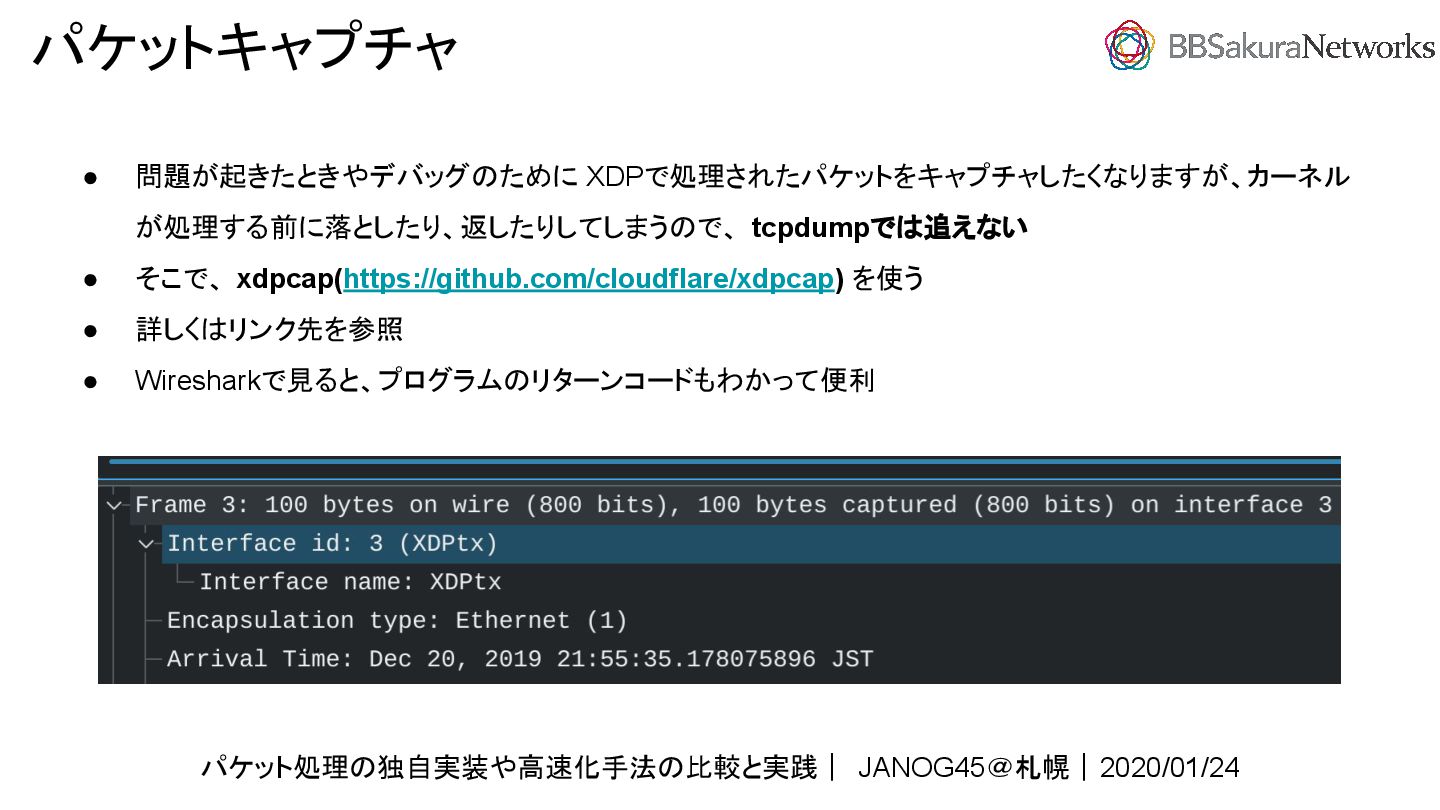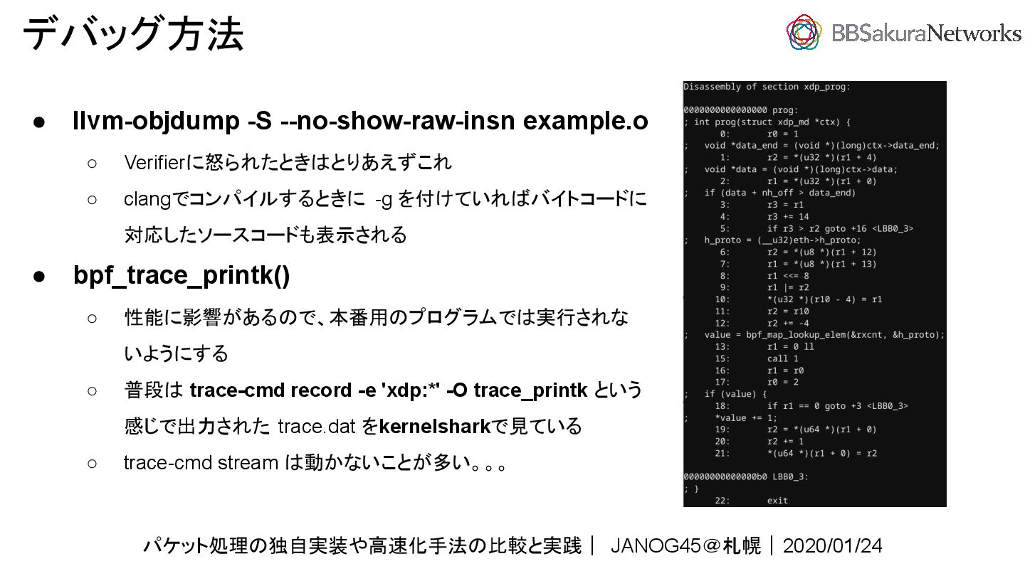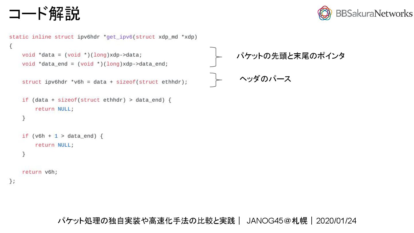 example.o sec xdp_prog ◦ ip link set dev eth0 xdp off • libbpfの場合 ◦ bpf_prog_load()でロードして、bpf_set_link_xdp_fd()でアタッチ/デタッチ ◦ 参考 https://github.com/xdp-project/xdp-tutorial/blob/master/basic01-xdp-pass/xdp_pass_user.c • bpftoolの場合(5.4以上 https://patchwork.ozlabs.org/cover/1145981/ ◦ bpftool prog load ./example.o /sys/fs/bpf/prog ▪ CONFIG_DEBUG_INFO_BTF=yなカーネルでないとlibbpfのエラー(22)が表示されるが ロードはされる ◦ bpftool prog list でidを確認 ◦ bpftool net attach xdp id 10 dev eth0 ◦ bpftool net detach xdp dev eth0 アタッチ/デタッチ パケット処理の独自実装や高速化手法の比較と実践| JANOG45@札幌|2020/01/24