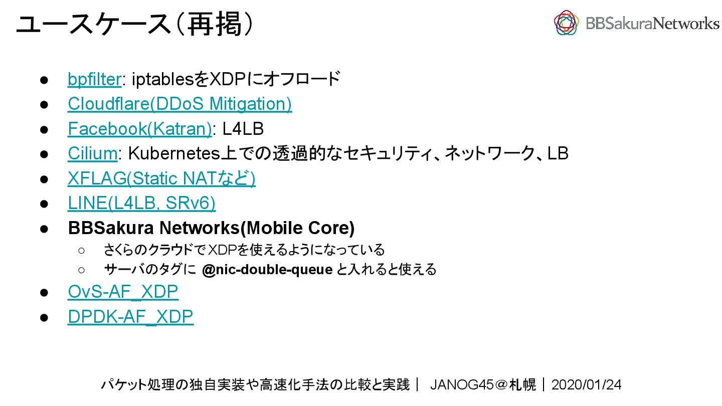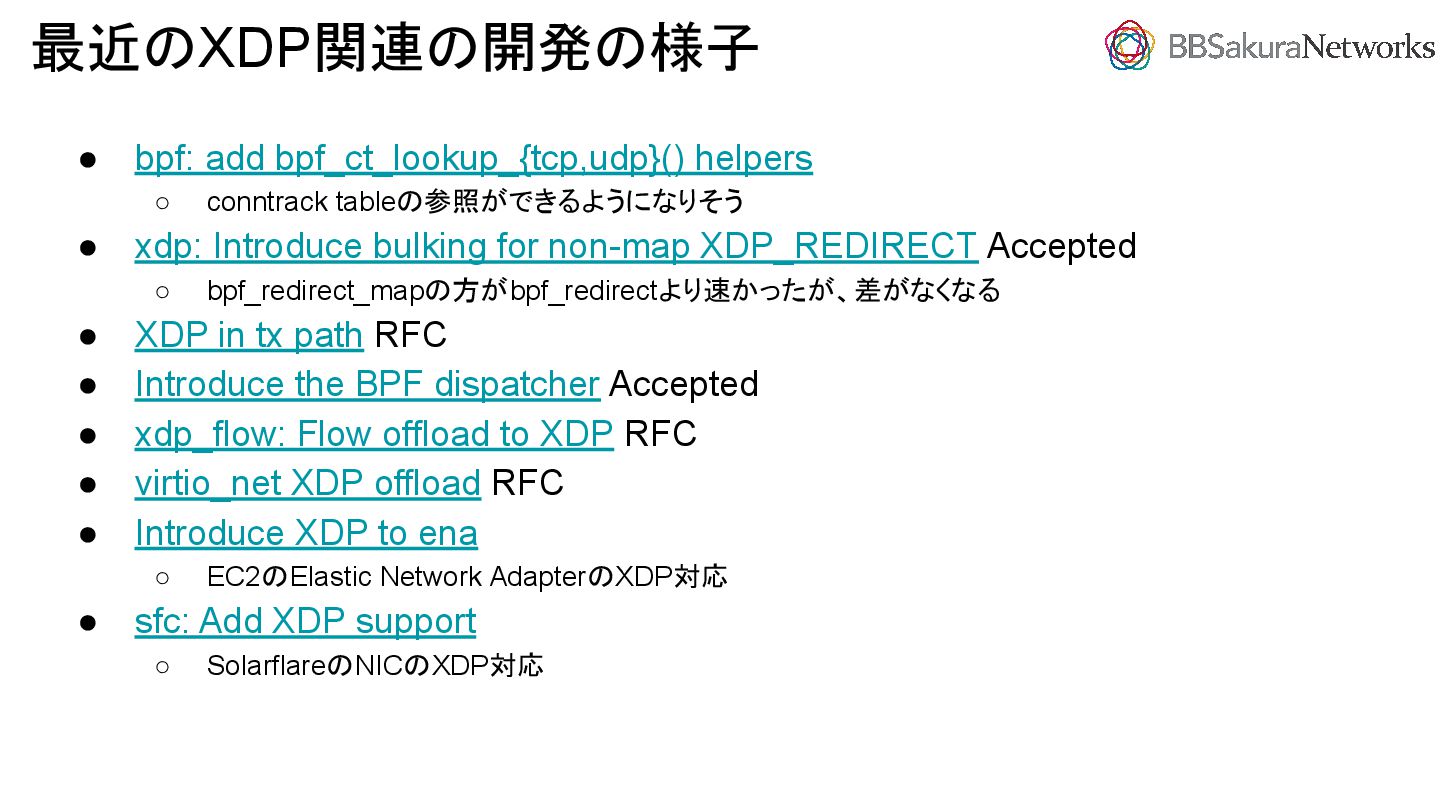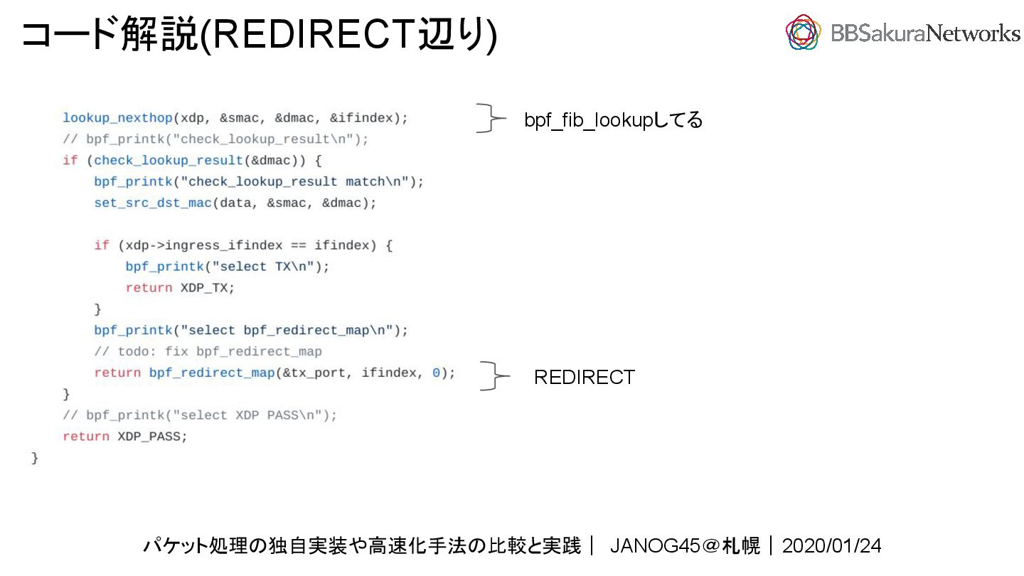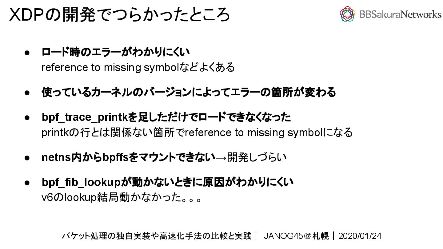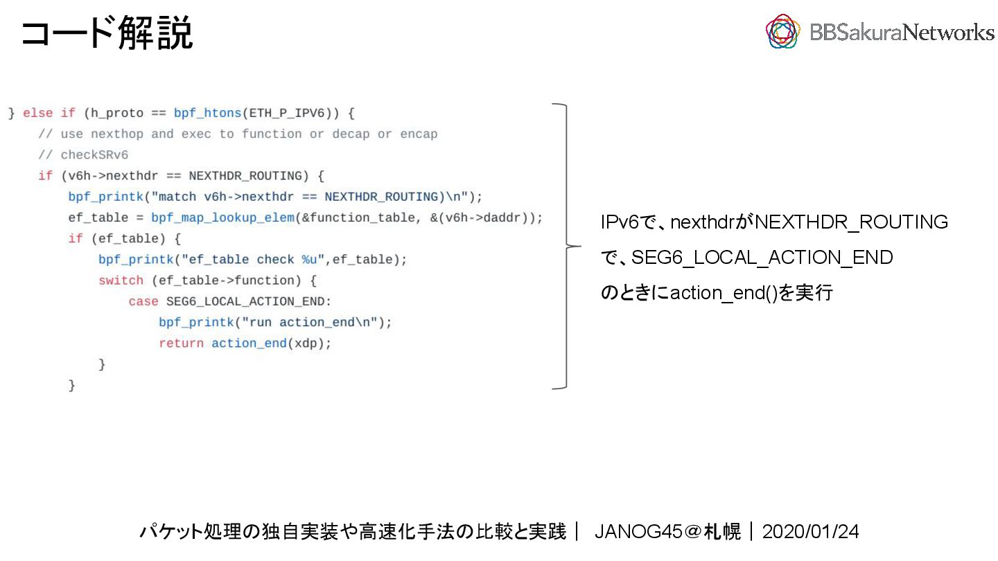 example.o sec xdp_prog ◦ ip link set dev eth0 xdp off • libbpfの場合 ◦ bpf_prog_load()でロードして、bpf_set_link_xdp_fd()でアタッチ/デタッチ ◦ 参考 https://github.com/xdp-project/xdp-tutorial/blob/master/basic01-xdp-pass/xdp_pass_user.c • bpftoolの場合(5.4以上 https://patchwork.ozlabs.org/cover/1145981/ ◦ bpftool prog load ./example.o /sys/fs/bpf/prog ▪ CONFIG_DEBUG_INFO_BTF=yなカーネルでないとlibbpfのエラー(22)が表示されるが ロードはされる ◦ bpftool prog list でidを確認 ◦ bpftool net attach xdp id 10 dev eth0 ◦ bpftool net detach xdp dev eth0 アタッチ/デタッチ パケット処理の独自実装や高速化手法の比較と実践| JANOG45@札幌|2020/01/24