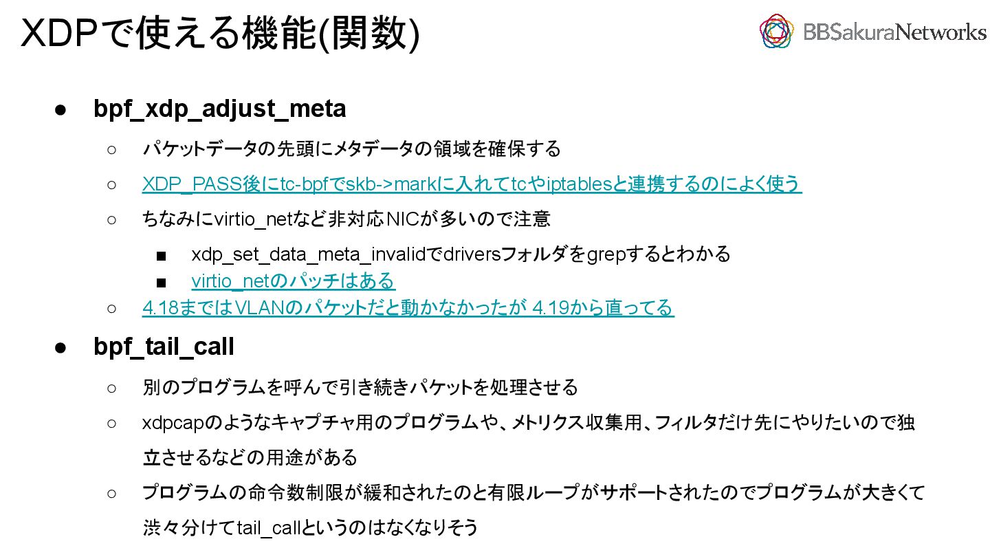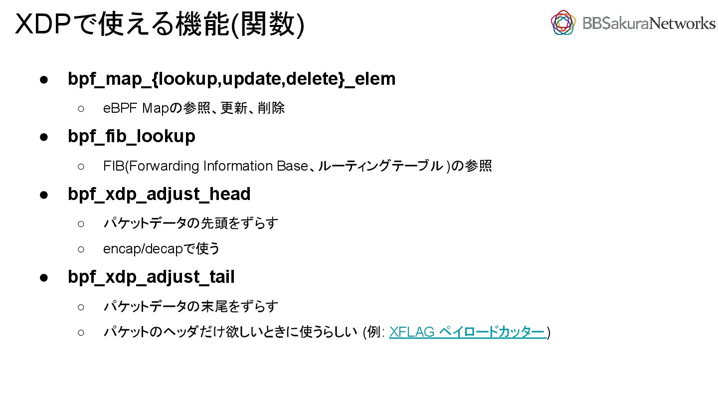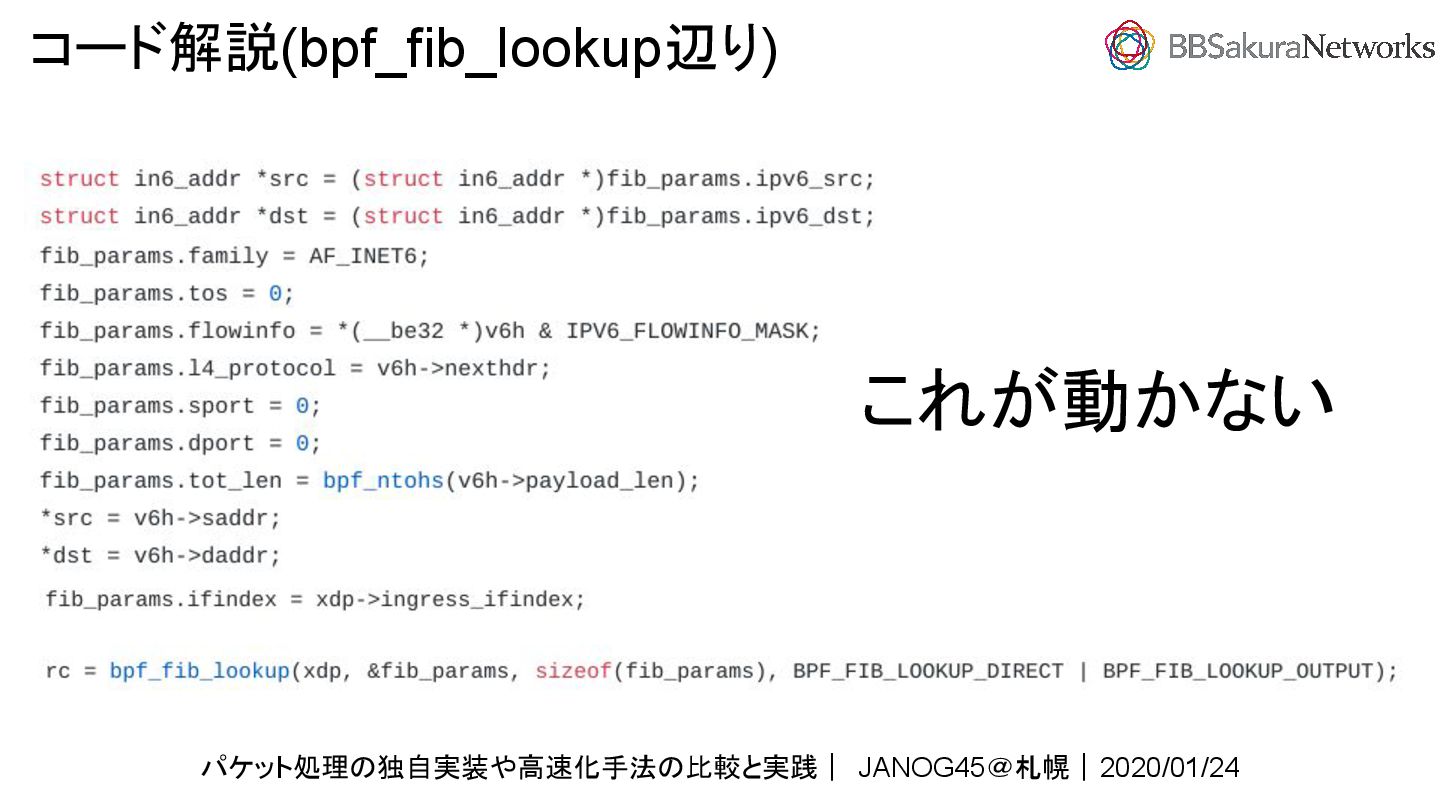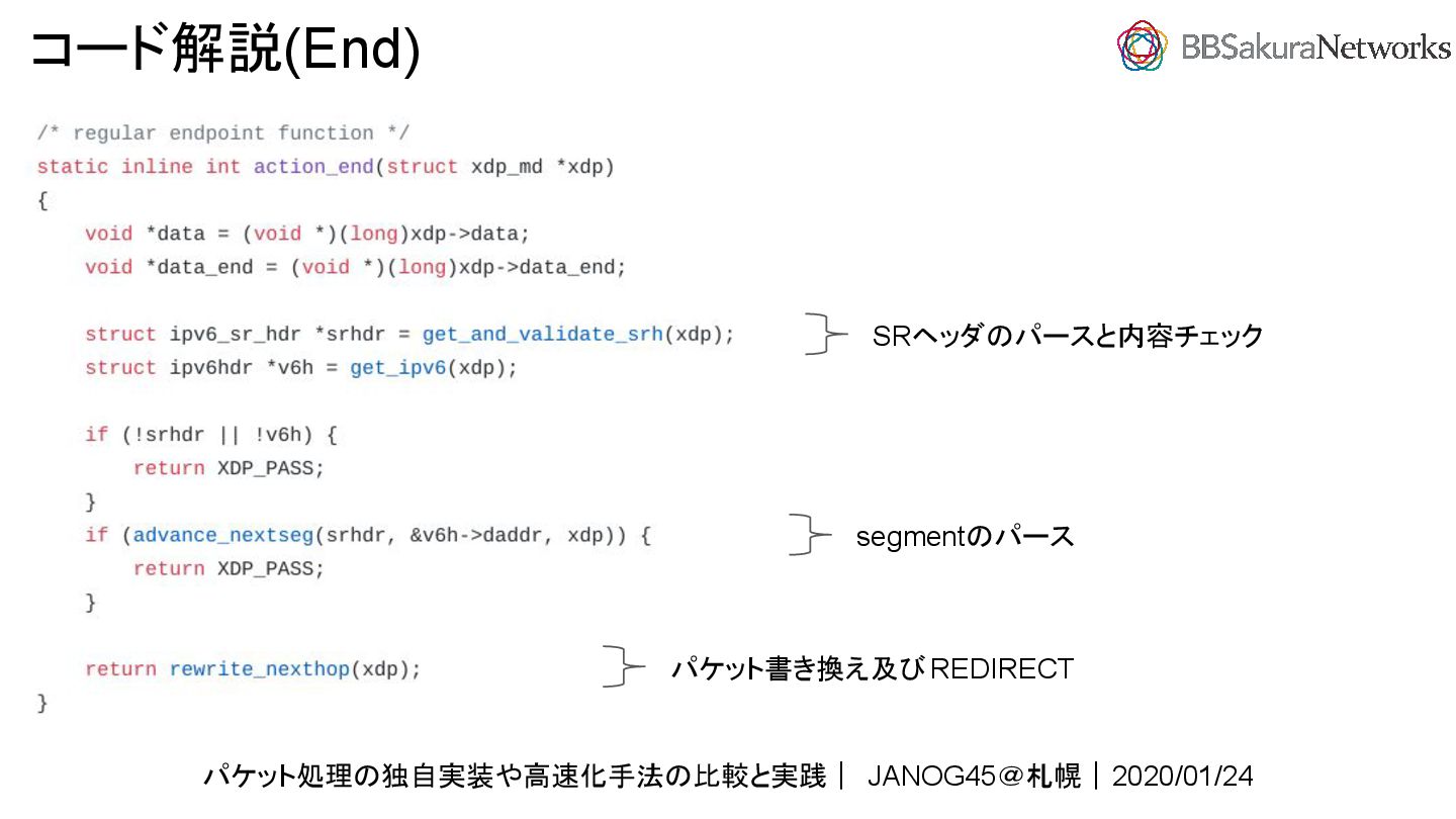 example.o sec xdp_prog ◦ ip link set dev eth0 xdp off • libbpfの場合 ◦ bpf_prog_load()でロードして、bpf_set_link_xdp_fd()でアタッチ/デタッチ ◦ 参考 https://github.com/xdp-project/xdp-tutorial/blob/master/basic01-xdp-pass/xdp_pass_user.c • bpftoolの場合(5.4以上 https://patchwork.ozlabs.org/cover/1145981/ ◦ bpftool prog load ./example.o /sys/fs/bpf/prog ▪ CONFIG_DEBUG_INFO_BTF=yなカーネルでないとlibbpfのエラー(22)が表示されるが ロードはされる ◦ bpftool prog list でidを確認 ◦ bpftool net attach xdp id 10 dev eth0 ◦ bpftool net detach xdp dev eth0 アタッチ/デタッチ パケット処理の独自実装や高速化手法の比較と実践| JANOG45@札幌|2020/01/24