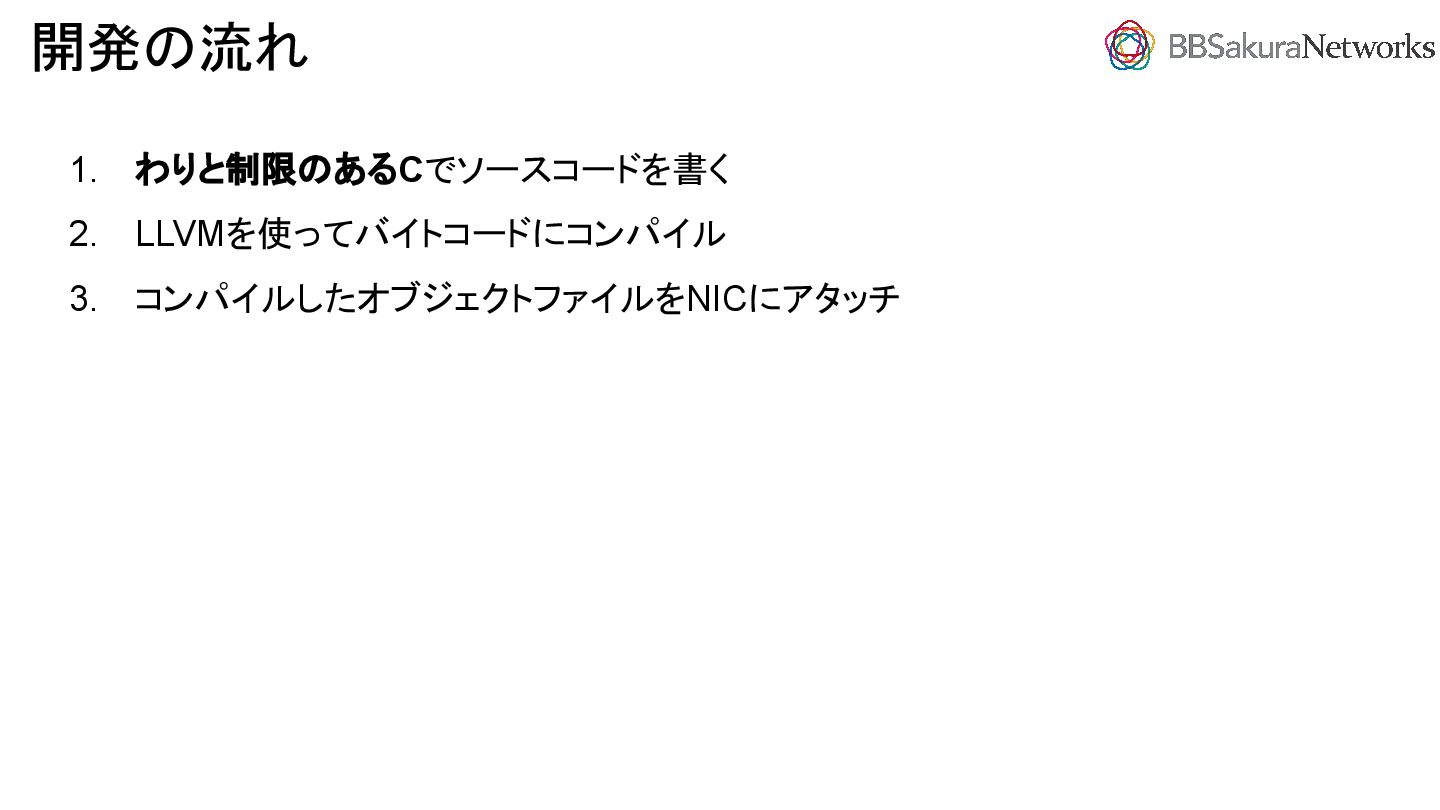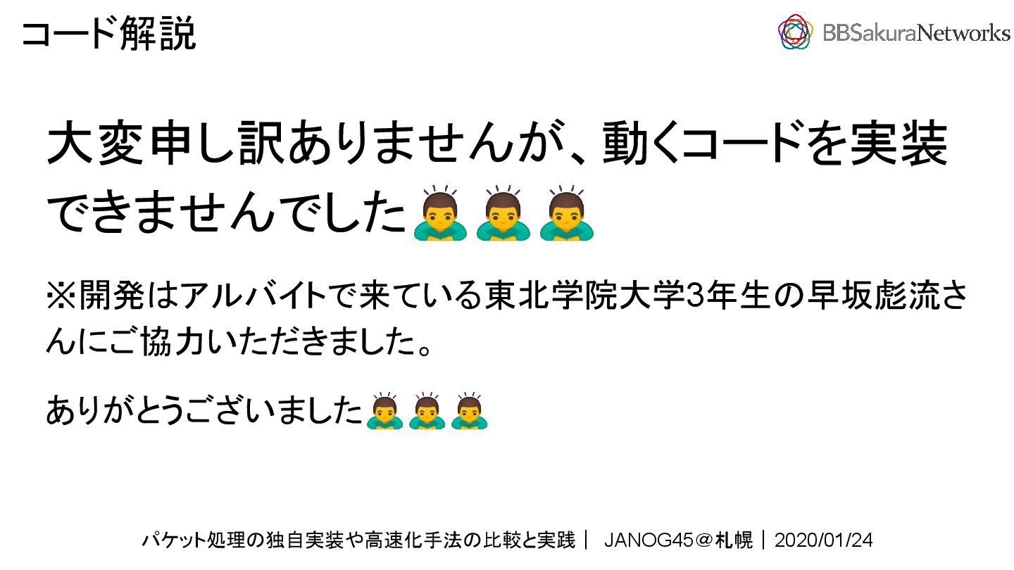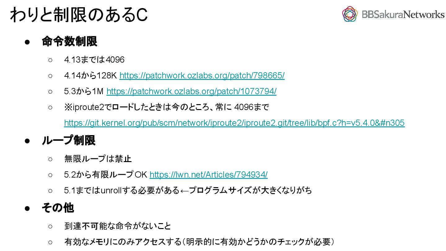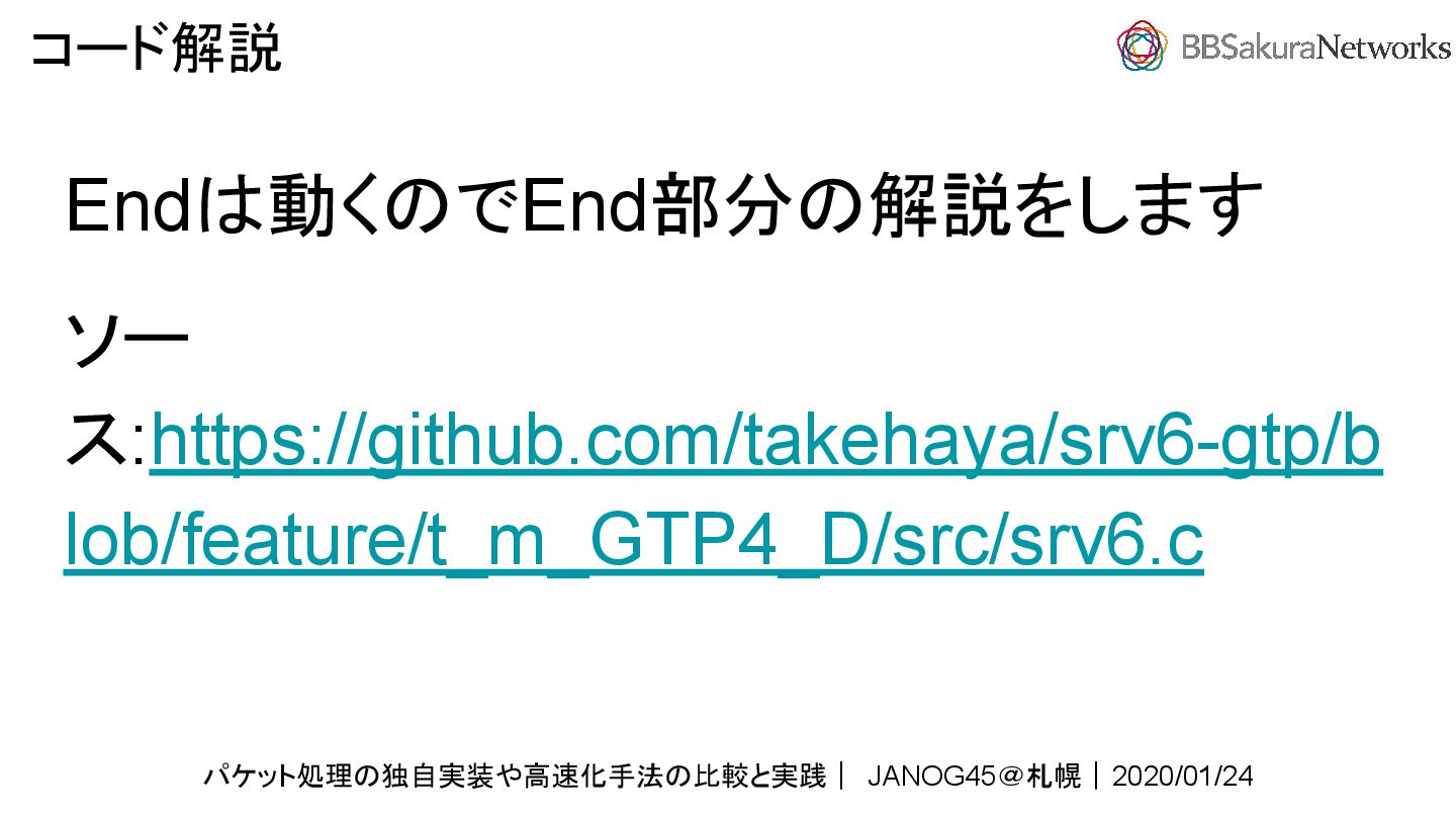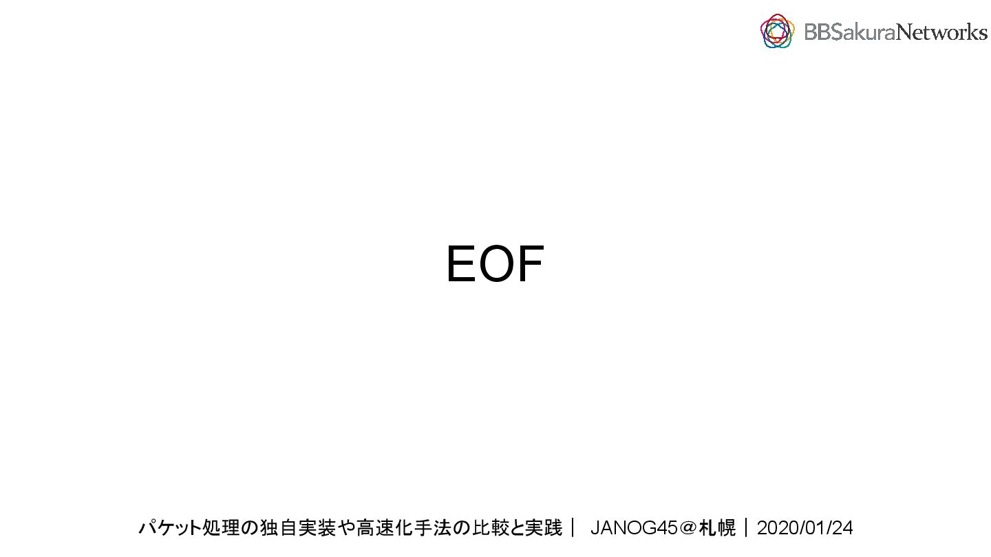 example.o sec xdp_prog ◦ ip link set dev eth0 xdp off • libbpfの場合 ◦ bpf_prog_load()でロードして、bpf_set_link_xdp_fd()でアタッチ/デタッチ ◦ 参考 https://github.com/xdp-project/xdp-tutorial/blob/master/basic01-xdp-pass/xdp_pass_user.c • bpftoolの場合(5.4以上 https://patchwork.ozlabs.org/cover/1145981/ ◦ bpftool prog load ./example.o /sys/fs/bpf/prog ▪ CONFIG_DEBUG_INFO_BTF=yなカーネルでないとlibbpfのエラー(22)が表示されるが ロードはされる ◦ bpftool prog list でidを確認 ◦ bpftool net attach xdp id 10 dev eth0 ◦ bpftool net detach xdp dev eth0 アタッチ/デタッチ パケット処理の独自実装や高速化手法の比較と実践| JANOG45@札幌|2020/01/24