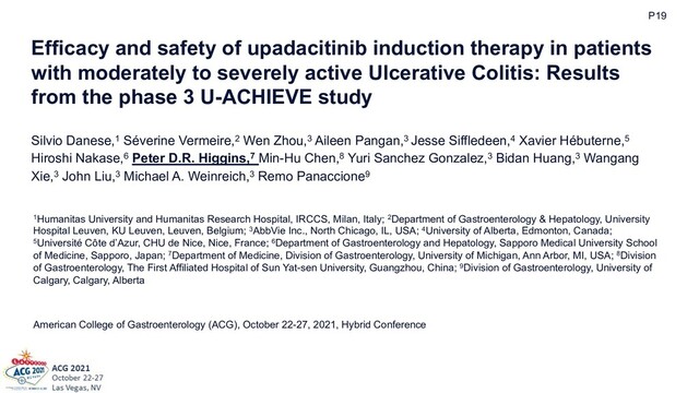 Efficacy and safety of upadacitinib induction therapy in patients with moderately to severely active Ulcerative Colitis: Results from the phase 3 U-ACHIEVE study Silvio Danese,1 Séverine Vermeire,2 Wen Zhou,3 Aileen Pangan,3 Jesse Siffledeen,4 Xavier Hébuterne,5 Hiroshi Nakase,6 Peter D.R. Higgins,7 Min-Hu Chen,8 Yuri Sanchez Gonzalez,3 Bidan Huang,3 Wangang Xie,3 John Liu,3 Michael A. Weinreich,3 Remo Panaccione9 Confidential Do not use externally | Company Confidential © 2019 1Humanitas University and Humanitas Research Hospital, IRCCS, Milan, Italy; 2Department of Gastroenterology & Hepatology, University Hospital Leuven, KU Leuven, Leuven, Belgium; 3AbbVie Inc., North Chicago, IL, USA; 4University of Alberta, Edmonton, Canada; 5Université Côte d’Azur, CHU de Nice, Nice, France; 6Department of Gastroenterology and Hepatology, Sapporo Medical University School of Medicine, Sapporo, Japan; 7Department of Medicine, Division of Gastroenterology, University of Michigan, Ann Arbor, MI, USA; 8Division of Gastroenterology, The First Affiliated Hospital of Sun Yat-sen University, Guangzhou, China; 9Division of Gastroenterology, University of Calgary, Calgary, Alberta American College of Gastroenterology (ACG), October 22-27, 2021, Hybrid Conference P19