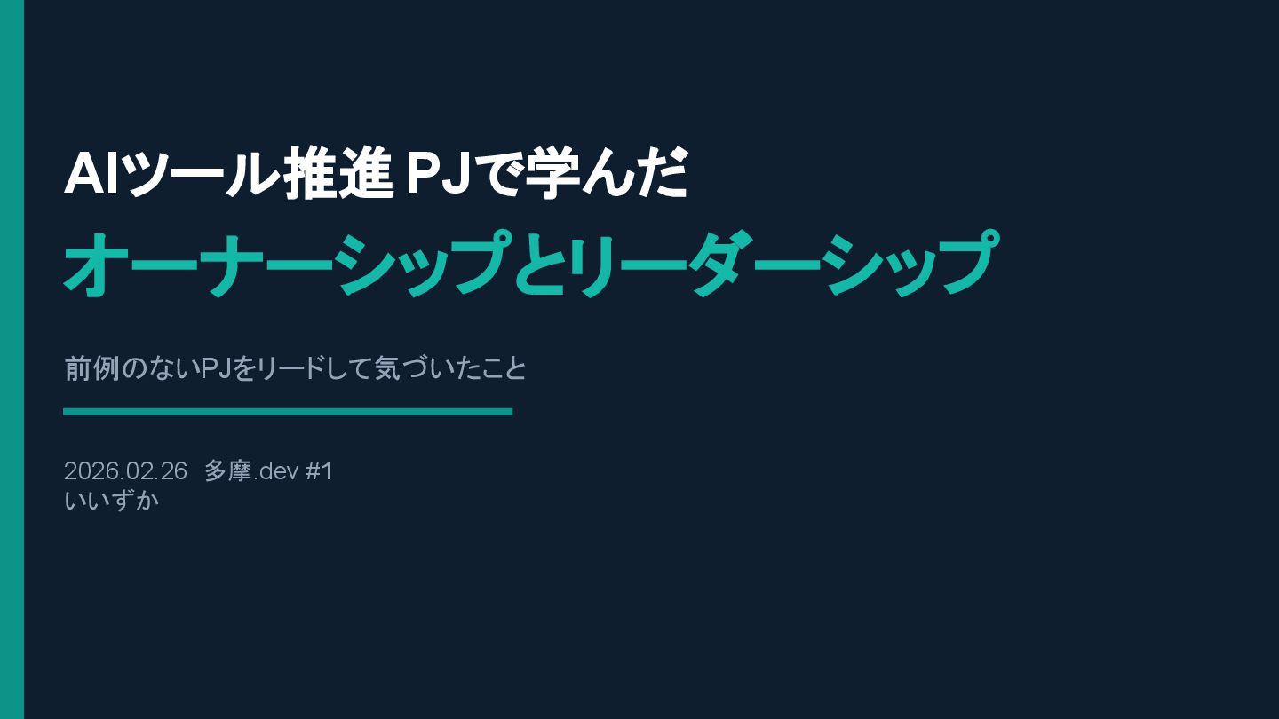 AIツール推進 PJで学んだ オーナーシップとリーダーシップ 前例のないPJをリードして気づいたこと 2026.02.26 多摩.dev #1 いいずか