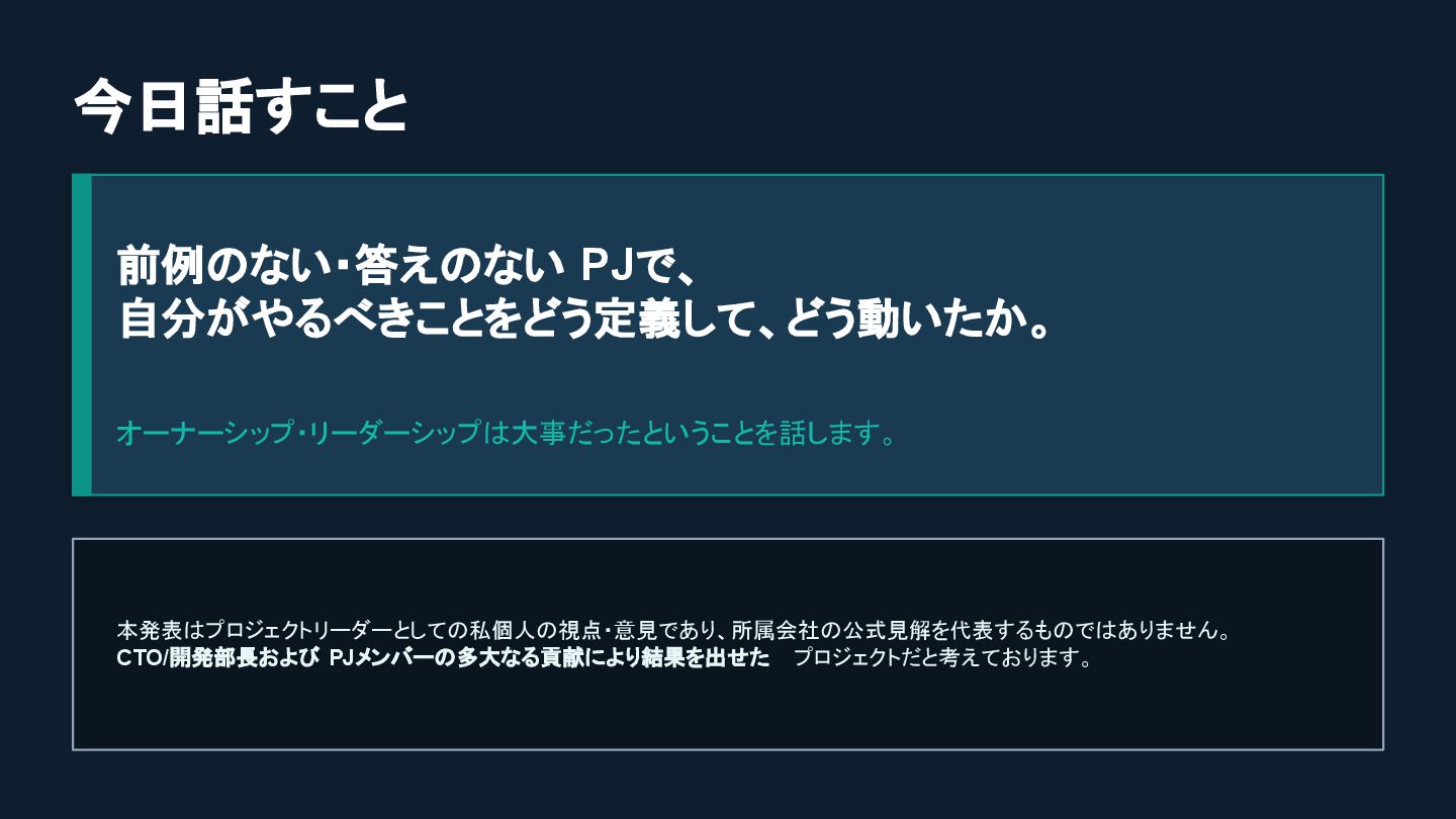 今日話すこと 前例のない・答えのない PJで、 自分がやるべきことをどう定義して、どう動いたか。 オーナーシップ・リーダーシップは大事だったということを話します。 本発表はプロジェクトリーダーとしての私個人の視点・意見であり、所属会社の公式見解を代表するものではありません。 CTO/開発部長および PJメンバーの多大なる貢献により結果を出せた プロジェクトだと考えております。