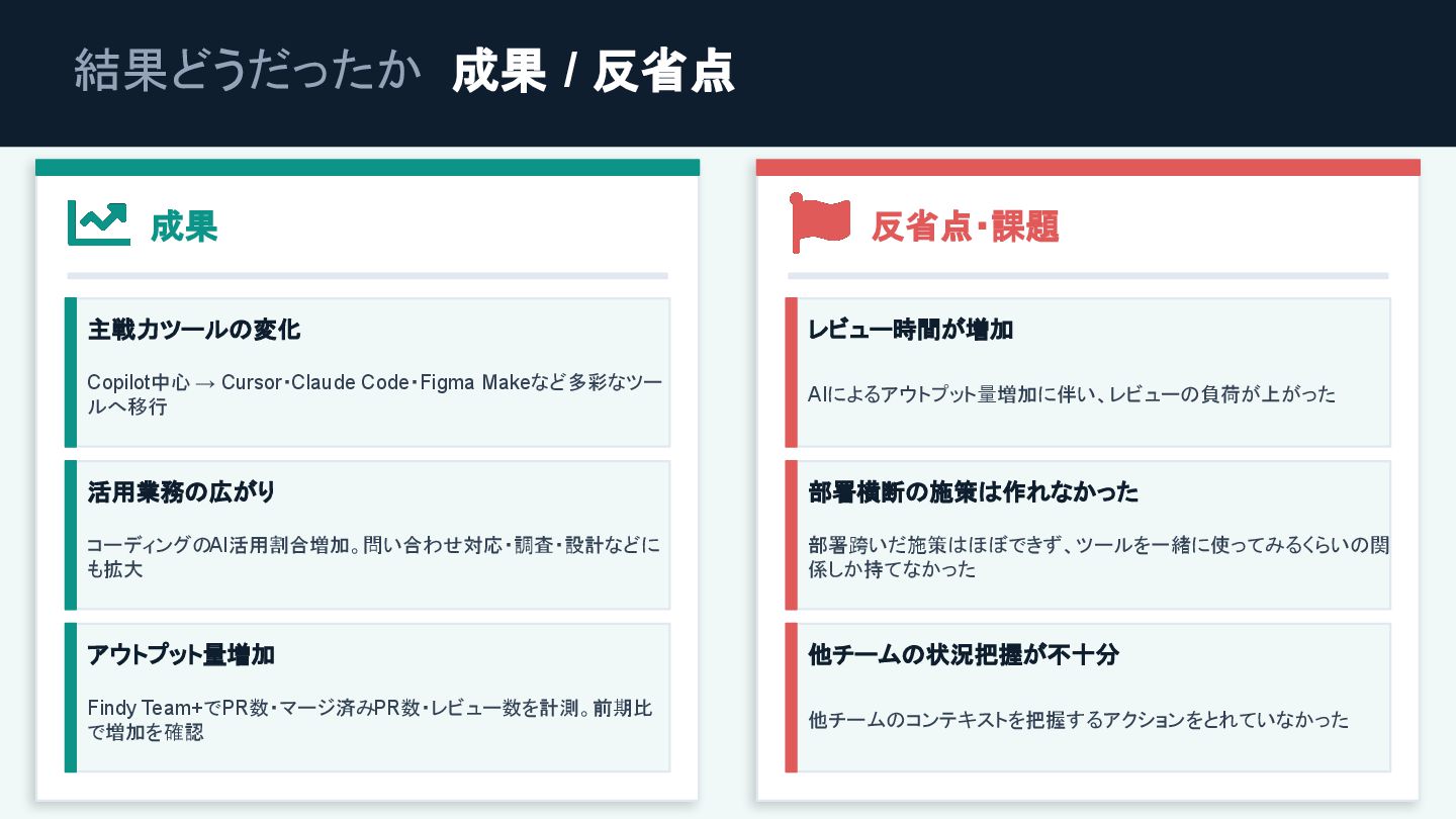 Makeなど多彩なツー ルへ移行 活用業務の広がり コーディングのAI活用割合増加。問い合わせ対応・調査・設計などに も拡大 アウトプット量増加 Findy Team+でPR数・マージ済みPR数・レビュー数を計測。前期比 で増加を確認 反省点・課題 レビュー時間が増加 AIによるアウトプット量増加に伴い、レビューの負荷が上がった 部署横断の施策は作れなかった 部署跨いだ施策はほぼできず、ツールを一緒に使ってみるくらいの関 係しか持てなかった 他チームの状況把握が不十分 他チームのコンテキストを把握するアクションをとれていなかった