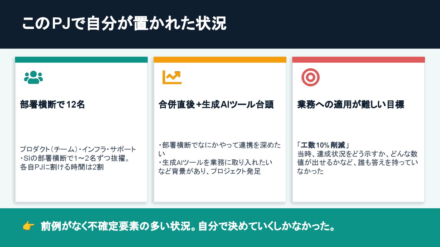 このPJで自分が置かれた状況 部署横断で 12名 プロダクト(チーム)・インフラ・サポート ・SIの部署横断で1〜2名ずつ抜擢。 各自PJに割ける時間は2割 合併直後+生成AIツール台頭 ・部署横断でなにかやって連携を深めた い ・生成AIツールを業務に取り入れたい