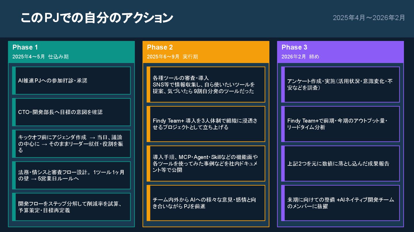 当日、議論 の中心に → そのままリーダー就任・役割を振 る 法務・情シスと審査フロー設計。 1ツール1ヶ月 の壁 → 5営業日ルールへ 開発フローをステップ分解して削減率を試算、 予算策定・目標再定義 Phase 2 2025年6〜9月 実行期 各種ツールの審査・導入 SNS等で情報収集し、自ら使いたいツールを 提案、気づいたら 9割自分発のツールだった Findy Team+ 導入を3人体制で組織に浸透さ せるプロジェクトとして立ち上げる 導入手順、MCP・Agent・Skillなどの機能面や 各ツールを使ってみた事例などを社内ドキュメ ント等で公開 チーム内外から AIへの様々な意見・感情と向 き合いながらPJを前進 Phase 3 2026年2月 締め アンケート作成・実施(活用状況・意識変化・不 安などを調査) Findy Team+で前期・今期のアウトプット量・ リードタイム分析 上記2つを元に数値に落とし込んだ成果報告 来期に向けての整備 +AIネイティブ開発チーム のメンバーに抜擢