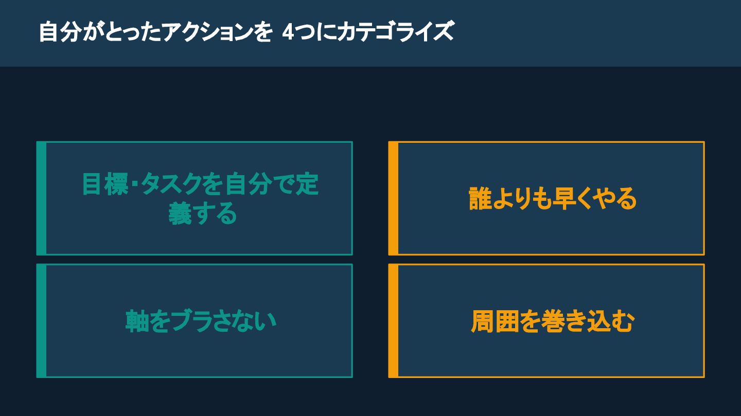 自分がとったアクションを 4つにカテゴライズ 目標・タスクを自分で定 義する 誰よりも早くやる 軸をブラさない 周囲を巻き込む