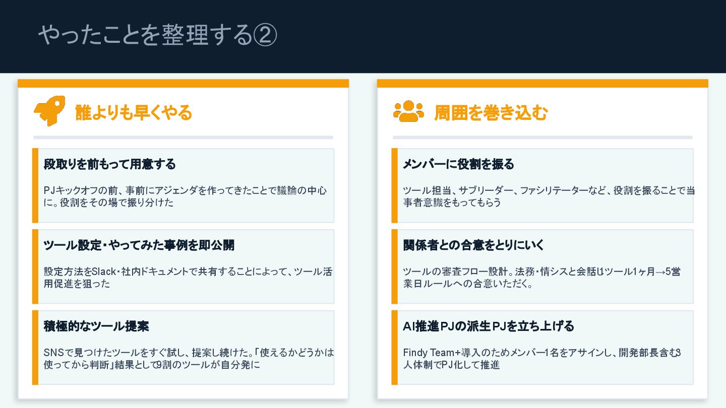 使ってから判断」結果として 9割のツールが自分発に 周囲を巻き込む メンバーに役割を振る ツール担当、サブリーダー、ファシリテーターなど、役割を振ることで当 事者意識をもってもらう 関係者との合意をとりにいく ツールの審査フロー設計。法務・情シスと会話し 1ツール1ヶ月→5営 業日ルールへの合意いただく。 AI推進PJの派生PJを立ち上げる Findy Team+導入のためメンバー 1名をアサインし、開発部長含む 3 人体制でPJ化して推進
