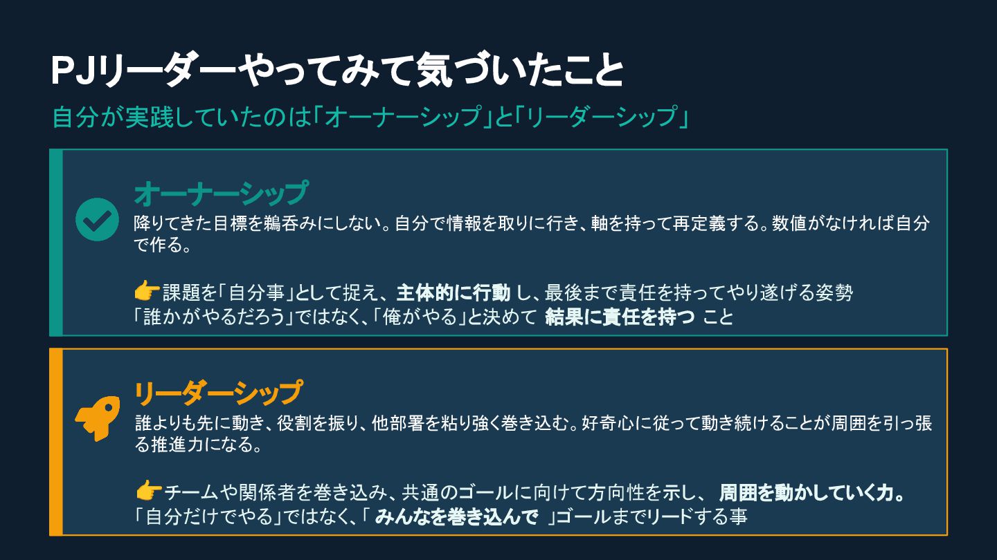 PJリーダーやってみて気づいたこと 自分が実践していたのは「オーナーシップ」と「リーダーシップ」 オーナーシップ 降りてきた目標を鵜呑みにしない。自分で情報を取りに行き、軸を持って再定義する。数値がなければ自分 で作る。 👉課題を「自分事」として捉え、 主体的に行動 し、最後まで責任を持ってやり遂げる姿勢 「誰かがやるだろう」ではなく、「俺がやる」と決めて 結果に責任を持つ