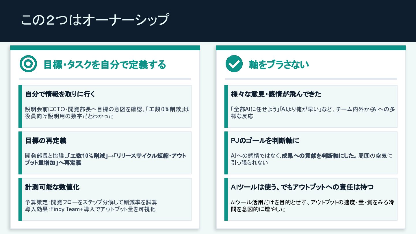 予算策定:開発フローをステップ分解して削減率を試算 導入効果:Findy Team+導入でアウトプット量を可視化 軸をブラさない 様々な意見・感情が飛んできた 「全部AIに任せよう」「AIより俺が早い」など、チーム内外から AIへの多 様な反応 PJのゴールを判断軸に AIへの感情ではなく、成果への貢献を判断軸にした。周囲の空気に 引っ張られない AIツールは使う、でもアウトプットへの責任は持つ AIツール活用だけを目的とせず、アウトプットの速度・量・質をみる時 間を意図的に増やした