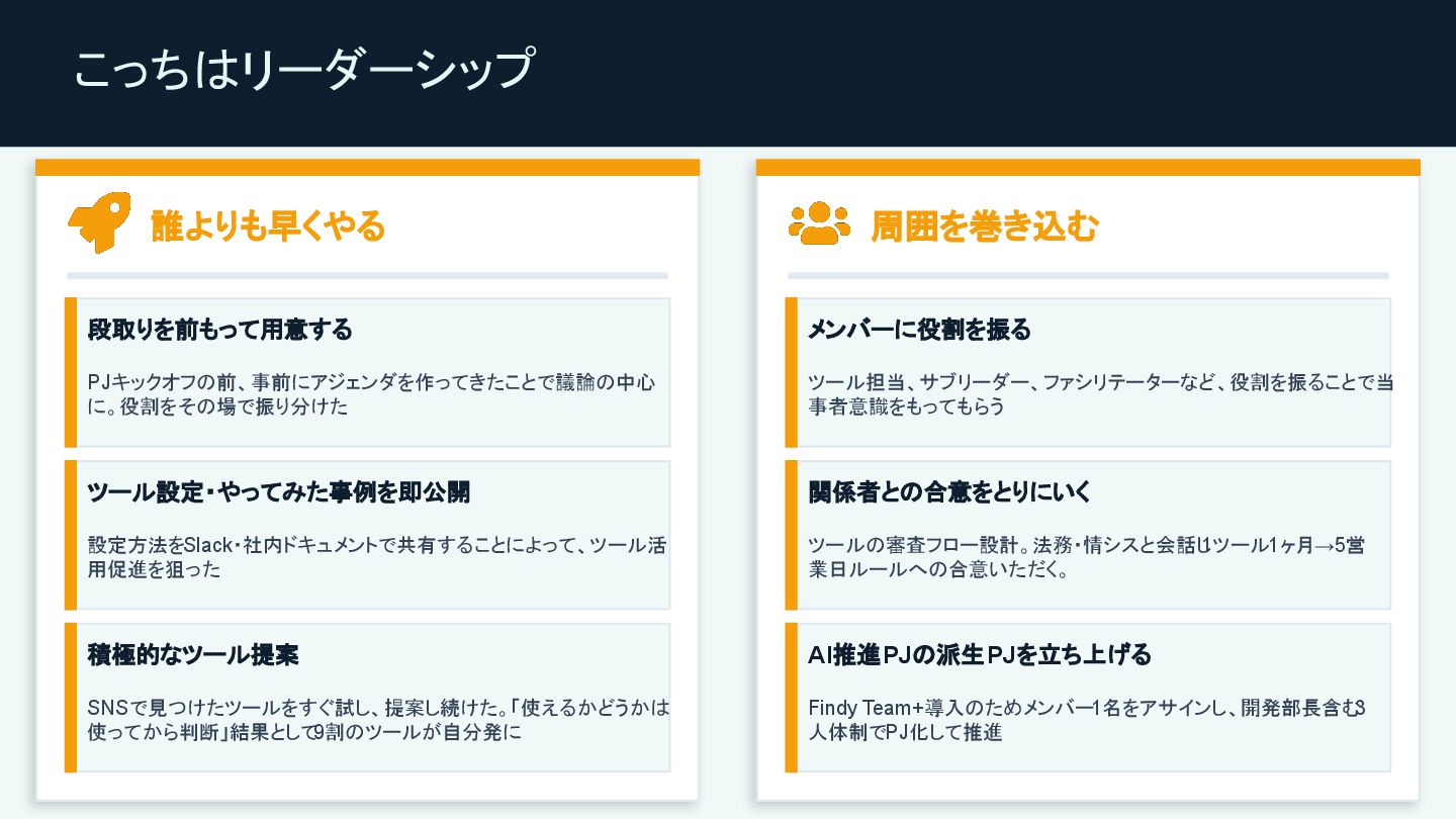 1年間AIツールの推進PJリーダーをやってきて、成果を出すのにオーナーシップやリーダーシップって大事だなと思ったことについて発表しました。
