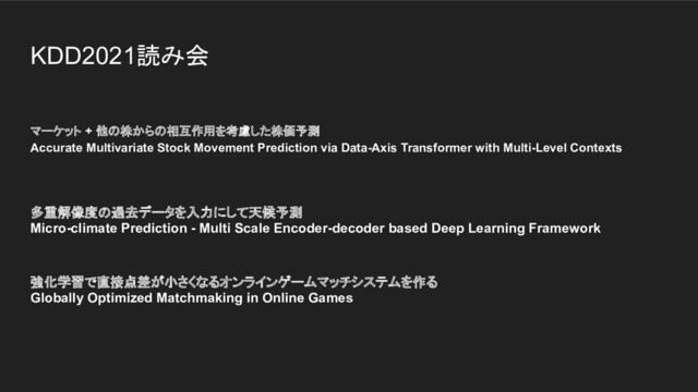 Transformer with Multi-Level Contexts 多重解像度の過去データを入力にして天候予測 Micro-climate Prediction - Multi Scale Encoder-decoder based Deep Learning Framework 強化学習で直接点差が小さくなるオンラインゲームマッチシステムを作る Globally Optimized Matchmaking in Online Games KDD2021読み会