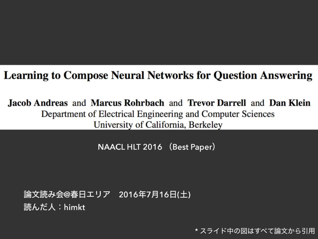 Andreas, Jacob, et al. "Learning to compose neural networks for question answering." arXiv preprint arXiv:1601.01705 (2016).
