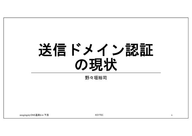 送信ドメイン認証 の現状 野々垣裕司 2019/09/07 DNS温泉6 in 下呂 1 KEYTEC