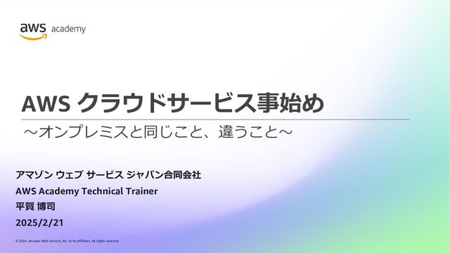 rights reserved. © 2025, Amazon Web Services, Inc. or its affiliates. All rights reserved. 開発環境の構築 本番環境構築 設定実施 新規環境を南米に構築 1,000台 のサーバー追加 1PB のデータベースを構築 AWS(クラウド): インフラは数分で準備完了 これまでのITシステム: 設備調達までに数週間 構築までに数週間 かかっていた 1,000 Instance Type M3 Extra Large Availability Zone US-West-2b Launch aws.amazon.com/managementconsole Number of Instances 即座に調達が可能(数クリックでインフラを調達) 必要な時だけ「利用」