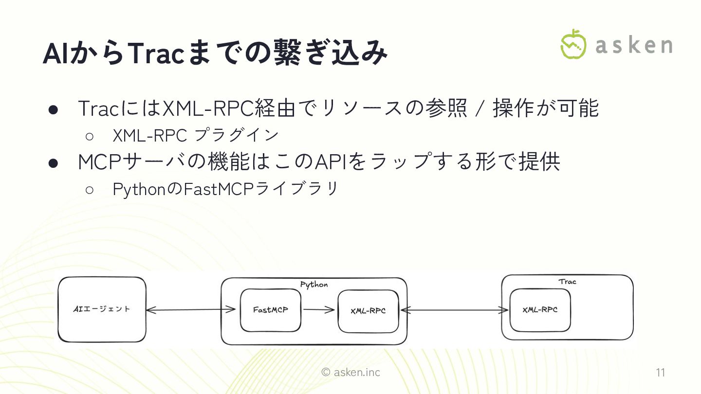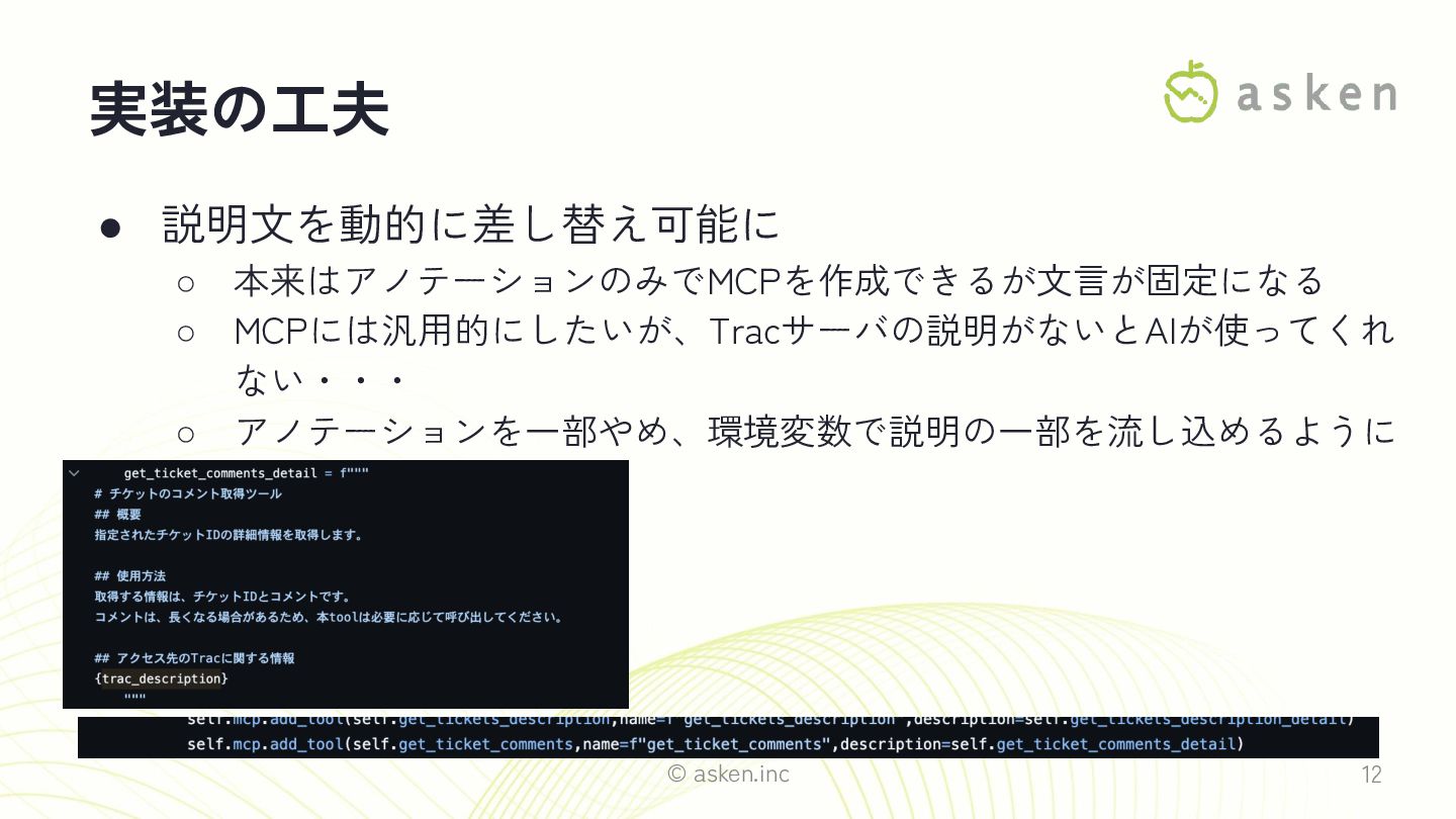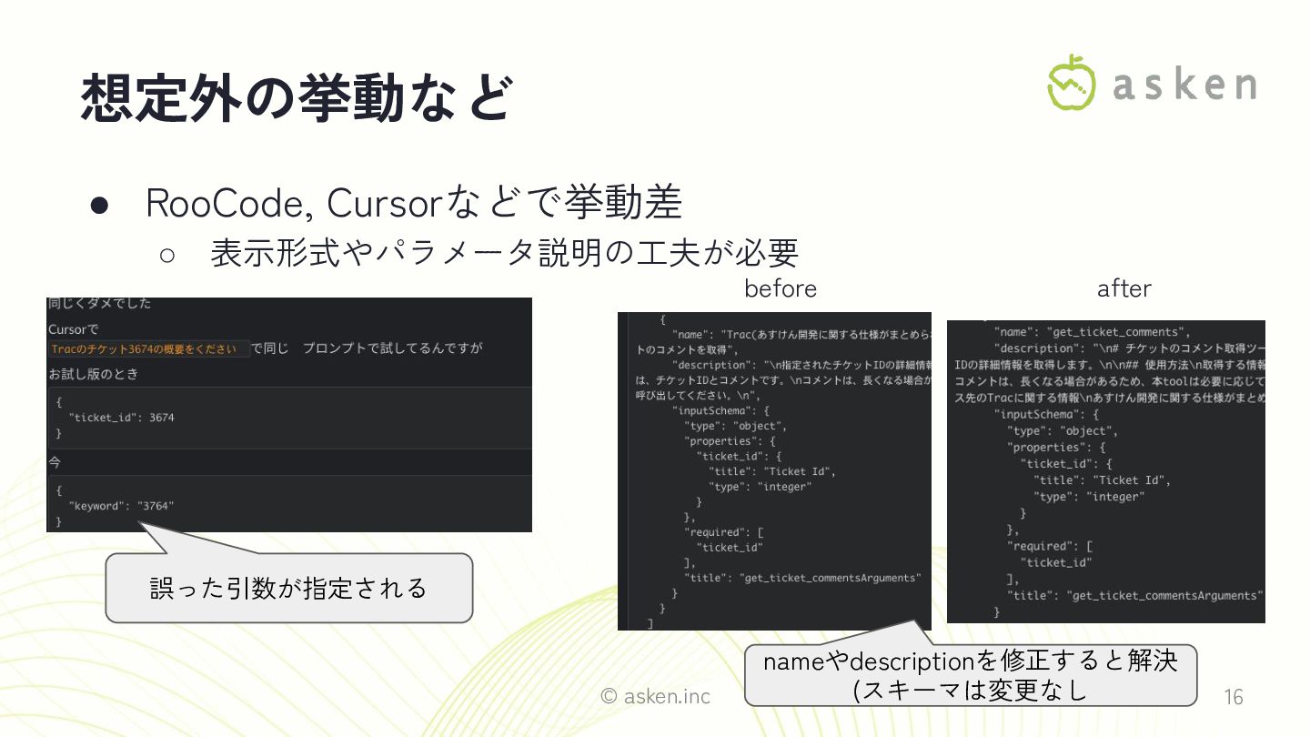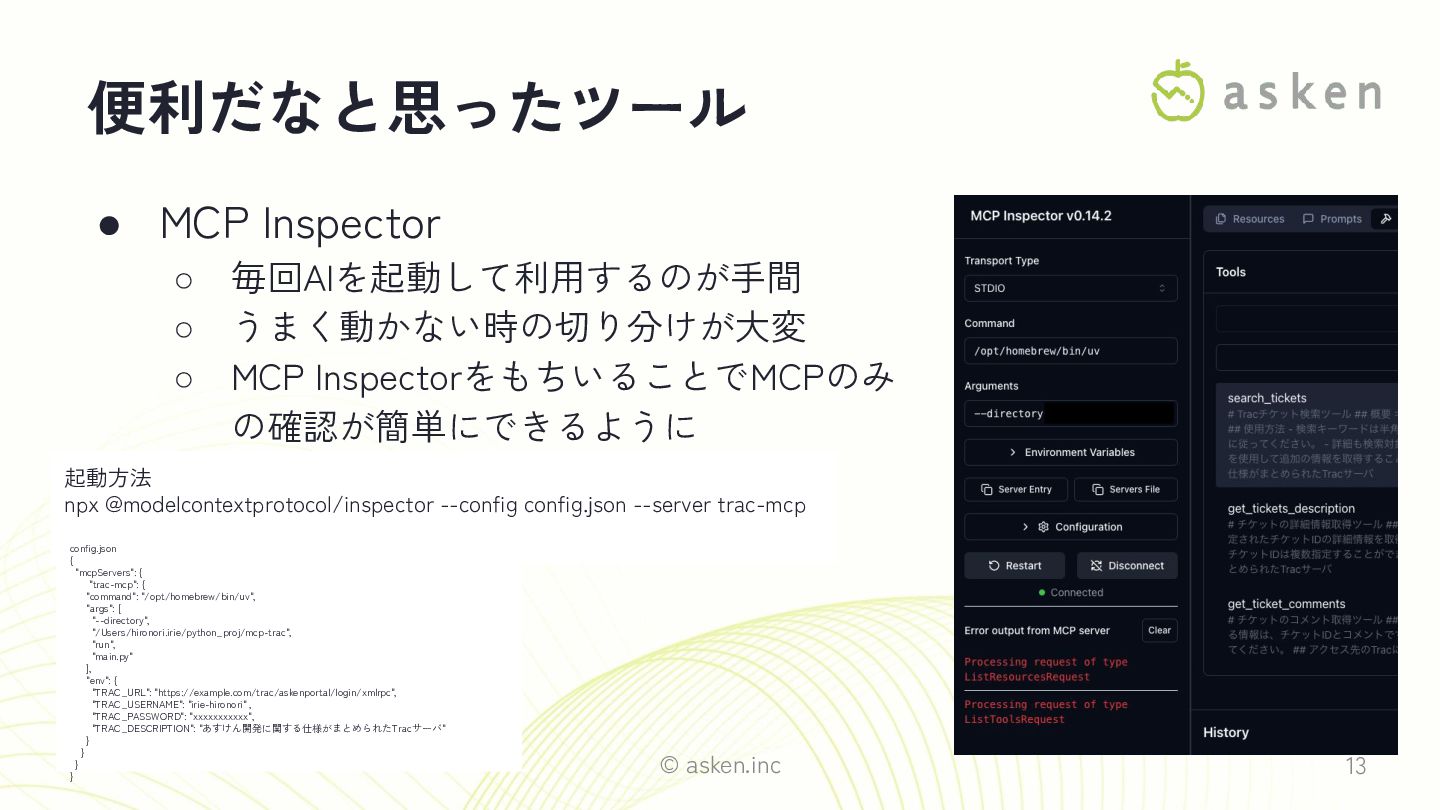 うまく動かない時の切り分けが大変 ◦ MCP InspectorをもちいることでMCPのみ の確認が簡単にできるように 起動方法 npx @modelcontextprotocol/inspector --config config.json --server trac-mcp config.json { "mcpServers": { "trac-mcp": { "command": "/opt/homebrew/bin/uv", "args": [ "--directory", "/Users/hironori.irie/python_proj/mcp-trac", "run", "main.py" ], "env": { "TRAC_URL": "https://example.com/trac/askenportal/login/xmlrpc", "TRAC_USERNAME": "irie-hironori" , "TRAC_PASSWORD": "xxxxxxxxxxx", "TRAC_DESCRIPTION": "あすけん開発に関する仕様がまとめられたTracサーバ" } } } }