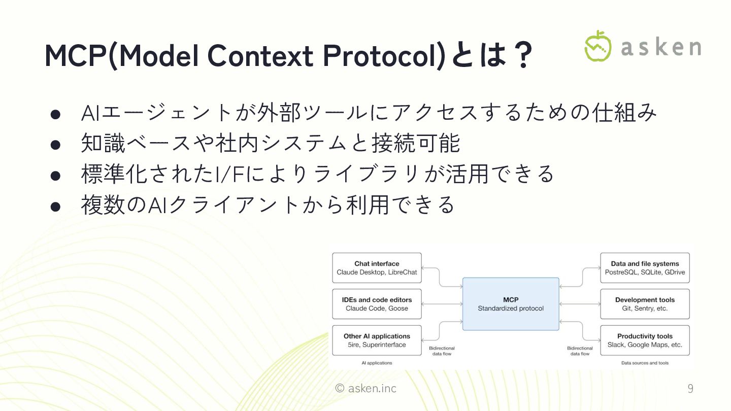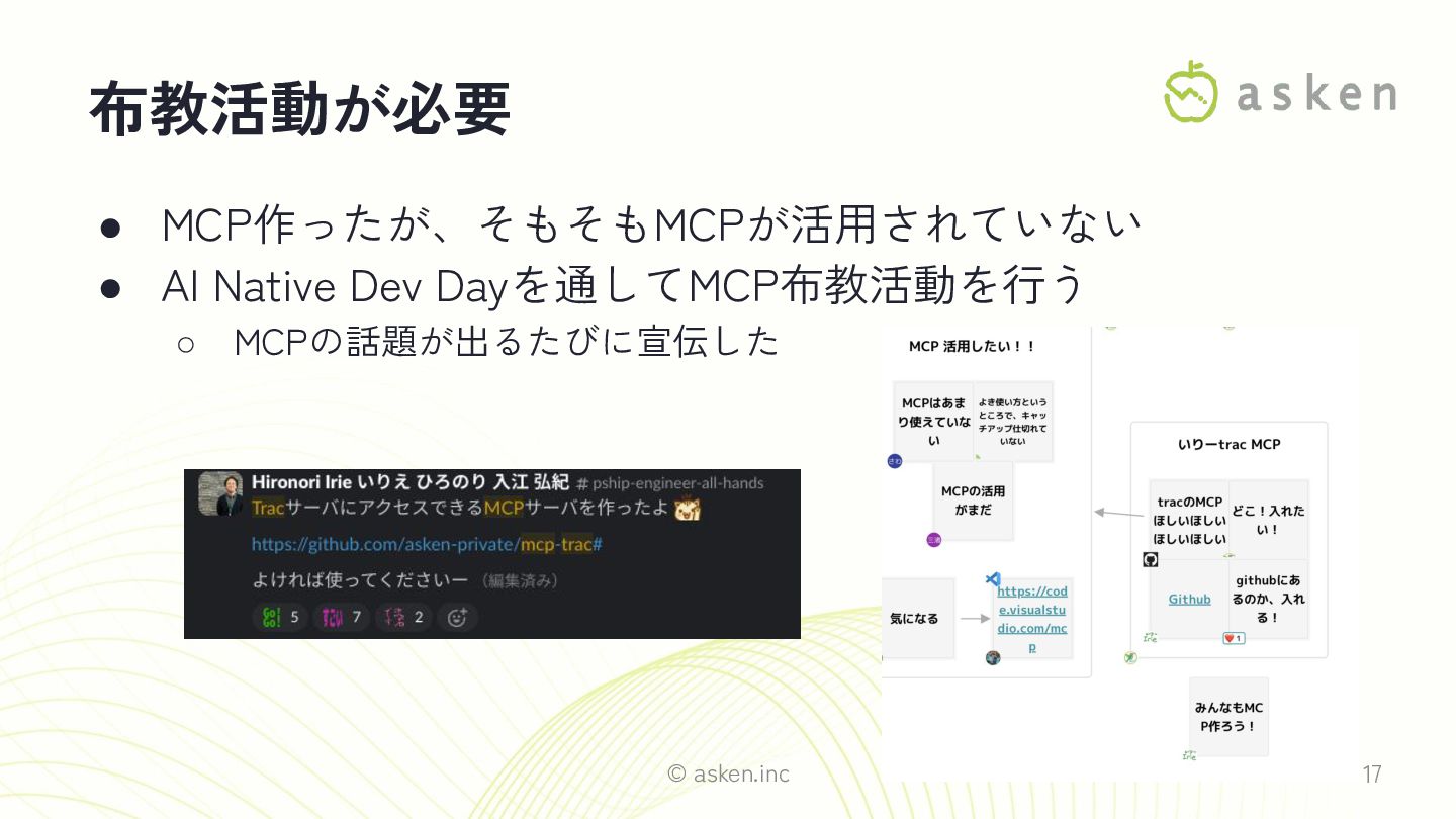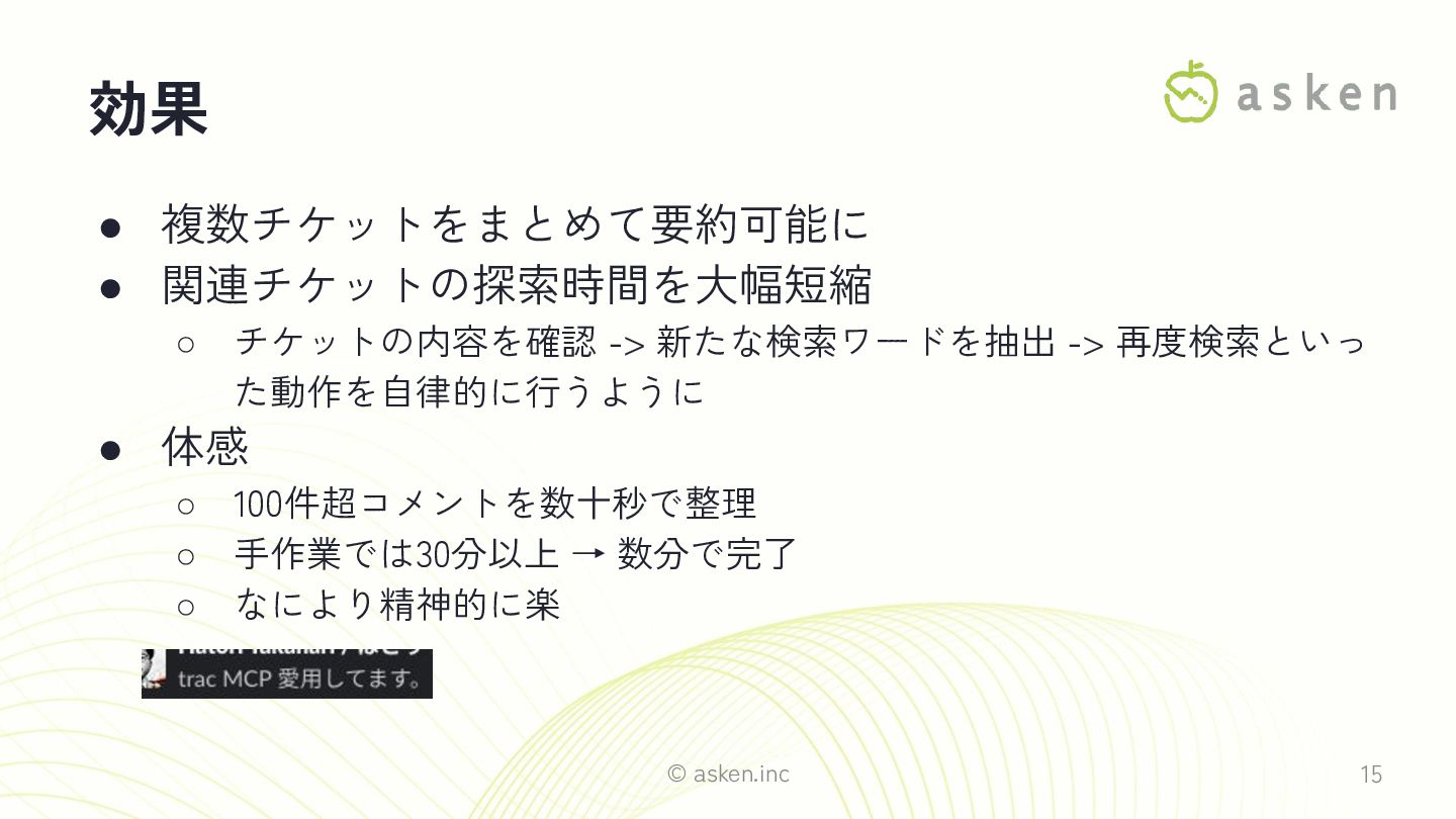 うまく動かない時の切り分けが大変 ◦ MCP InspectorをもちいることでMCPのみ の確認が簡単にできるように 起動方法 npx @modelcontextprotocol/inspector --config config.json --server trac-mcp config.json { "mcpServers": { "trac-mcp": { "command": "/opt/homebrew/bin/uv", "args": [ "--directory", "/Users/hironori.irie/python_proj/mcp-trac", "run", "main.py" ], "env": { "TRAC_URL": "https://example.com/trac/askenportal/login/xmlrpc", "TRAC_USERNAME": "irie-hironori" , "TRAC_PASSWORD": "xxxxxxxxxxx", "TRAC_DESCRIPTION": "あすけん開発に関する仕様がまとめられたTracサーバ" } } } }