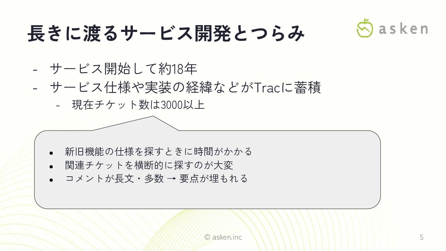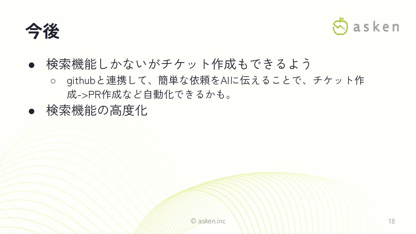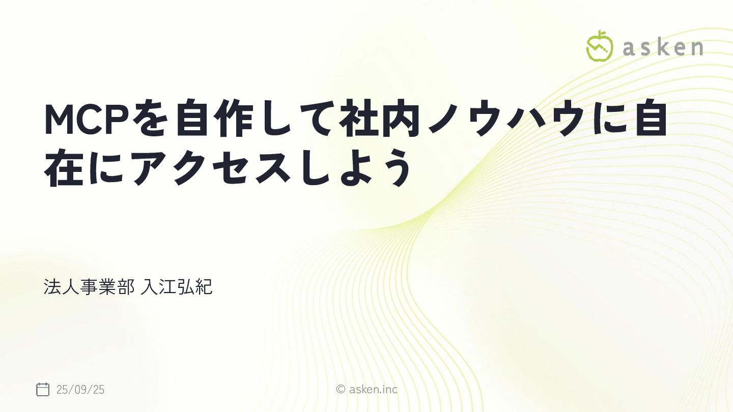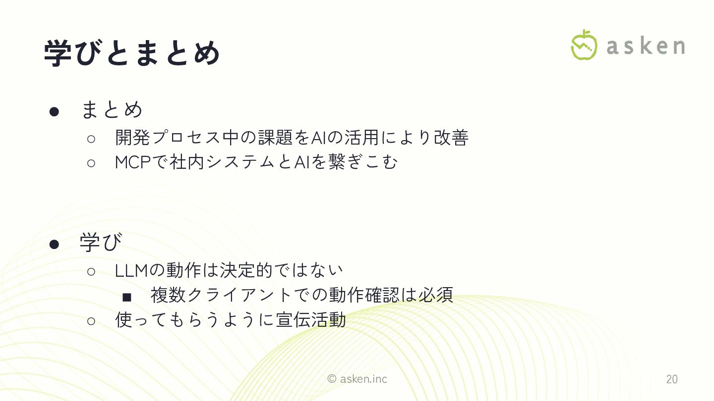 うまく動かない時の切り分けが大変 ◦ MCP InspectorをもちいることでMCPのみ の確認が簡単にできるように 起動方法 npx @modelcontextprotocol/inspector --config config.json --server trac-mcp config.json { "mcpServers": { "trac-mcp": { "command": "/opt/homebrew/bin/uv", "args": [ "--directory", "/Users/hironori.irie/python_proj/mcp-trac", "run", "main.py" ], "env": { "TRAC_URL": "https://example.com/trac/askenportal/login/xmlrpc", "TRAC_USERNAME": "irie-hironori" , "TRAC_PASSWORD": "xxxxxxxxxxx", "TRAC_DESCRIPTION": "あすけん開発に関する仕様がまとめられたTracサーバ" } } } }