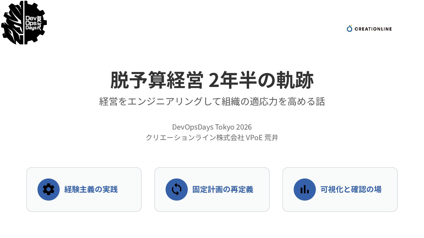 脱予算経営 2年半の軌跡 経営をエンジニアリングして組織の適応⼒を⾼める話 DevOpsDays Tokyo 2026 クリエーションライン株式会社 VPoE 荒井