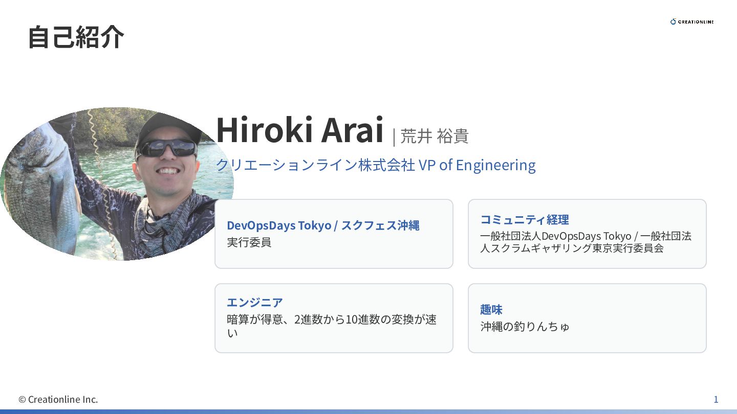 DevOpsDays Tokyo / スクフェス沖縄 実⾏委員 コミュニティ経理 ⼀般社団法⼈DevOpsDays Tokyo / ⼀般社団法 ⼈スクラムギャザリング東京実⾏委員会 エンジニア 暗算が得意、2進数から10進数の変換が速 い 趣味 沖縄の釣りんちゅ © Creationline Inc. 1