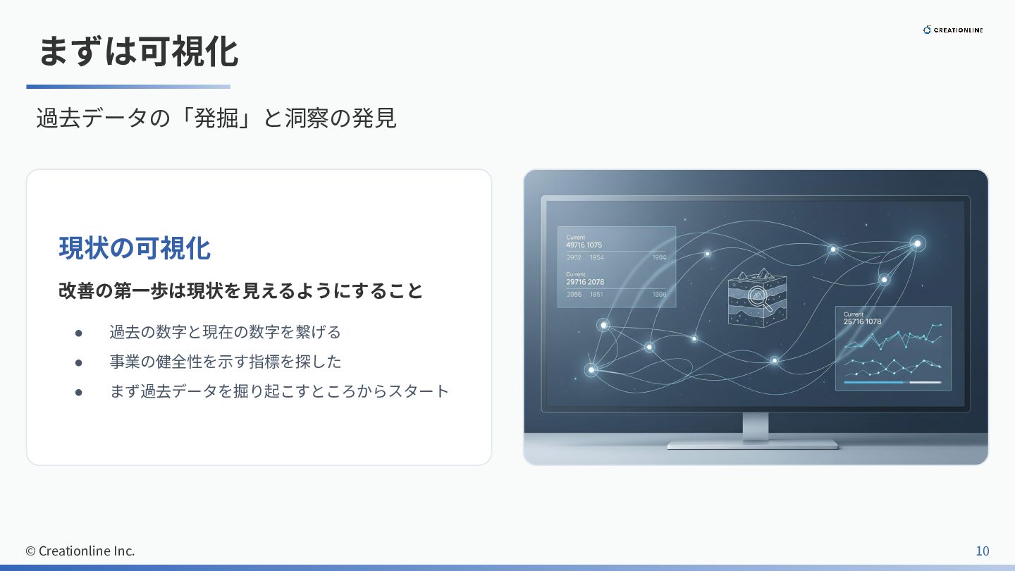まずは可視化 過去データの「発掘」と洞察の発⾒ © Creationline Inc. 10 現状の可視化 改善の第⼀歩は現状を⾒えるようにすること • 過去の数字と現在の数字を繋げる