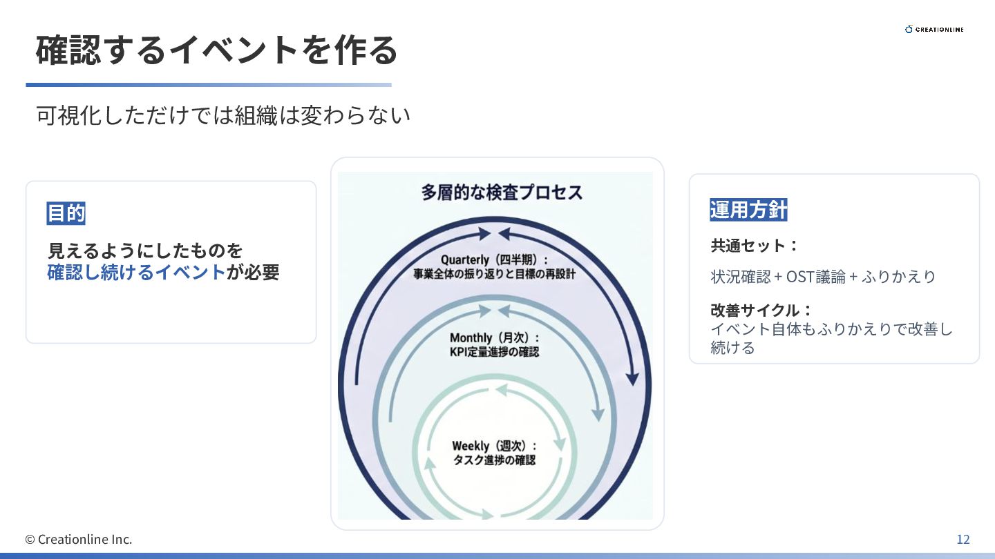 確認するイベントを作る 可視化しただけでは組織は変わらない ⽬的 ⾒えるようにしたものを 確認し続けるイベントが必要 運⽤⽅針 共通セット: 状況確認 + OST議論