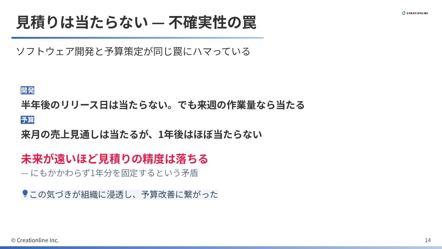 にもかかわらず1年分を固定するという⽭盾 この気づきが組織に浸透し、予算改善に繋がった © Creationline Inc. 14