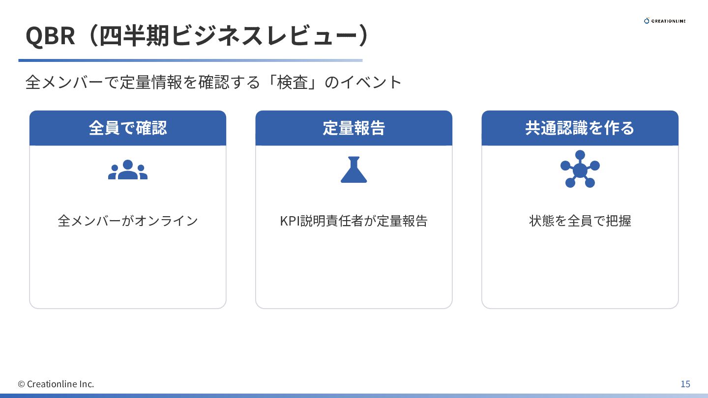 QBR(四半期ビジネスレビュー) 全メンバーで定量情報を確認する「検査」のイベント 全員で確認 全メンバーがオンライン 定量報告 KPI説明責任者が定量報告 共通認識を作る