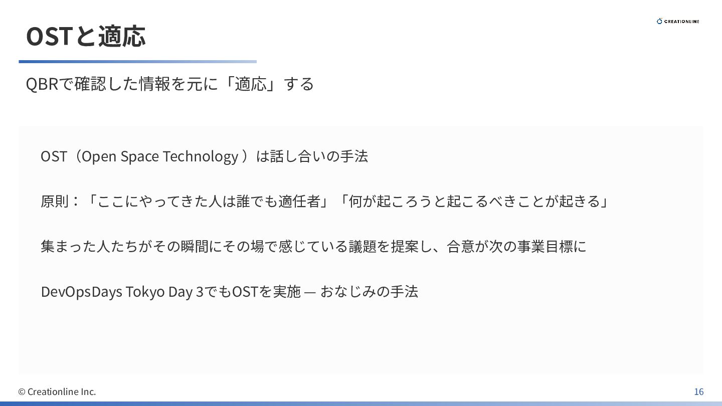 OSTと適応 QBRで確認した情報を元に「適応」する OST(Open Space Technology )は話し合いの⼿法 原則:「ここにやってきた⼈は誰でも適任者」「何が起ころうと起こるべきことが起きる」 集まった⼈たちがその瞬間にその場で感じている議題を提案し、合意が次の事業⽬標に DevOpsDays Tokyo